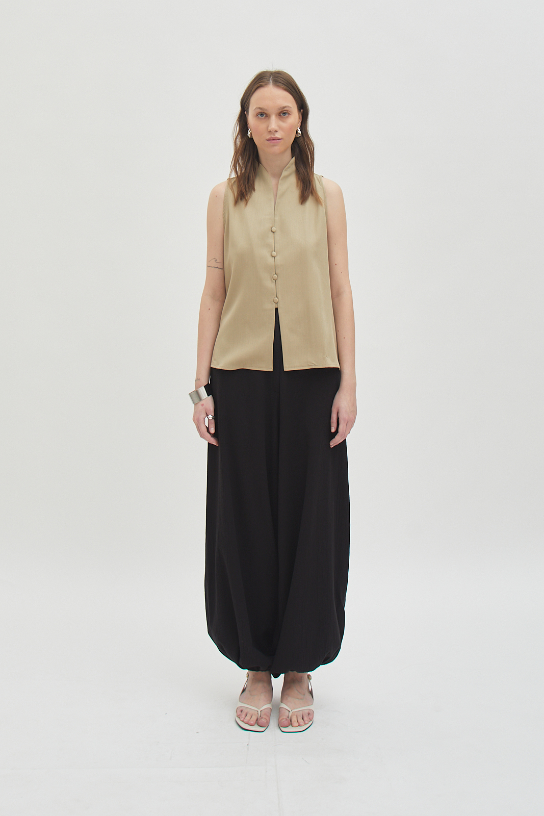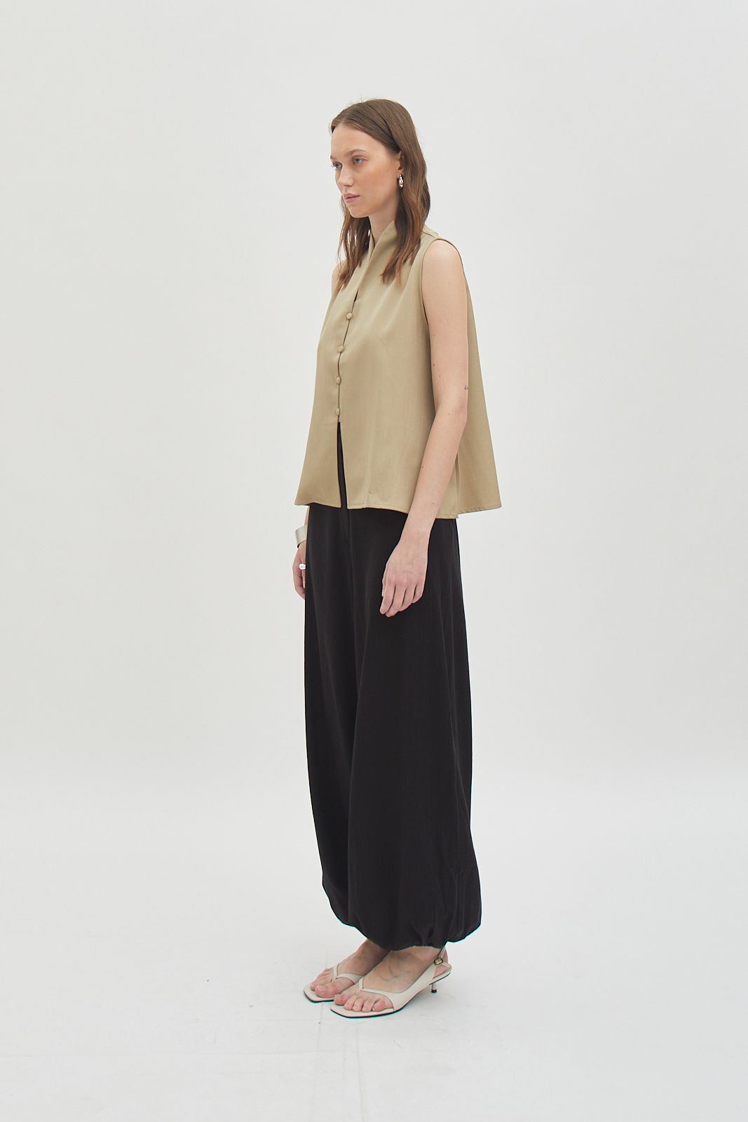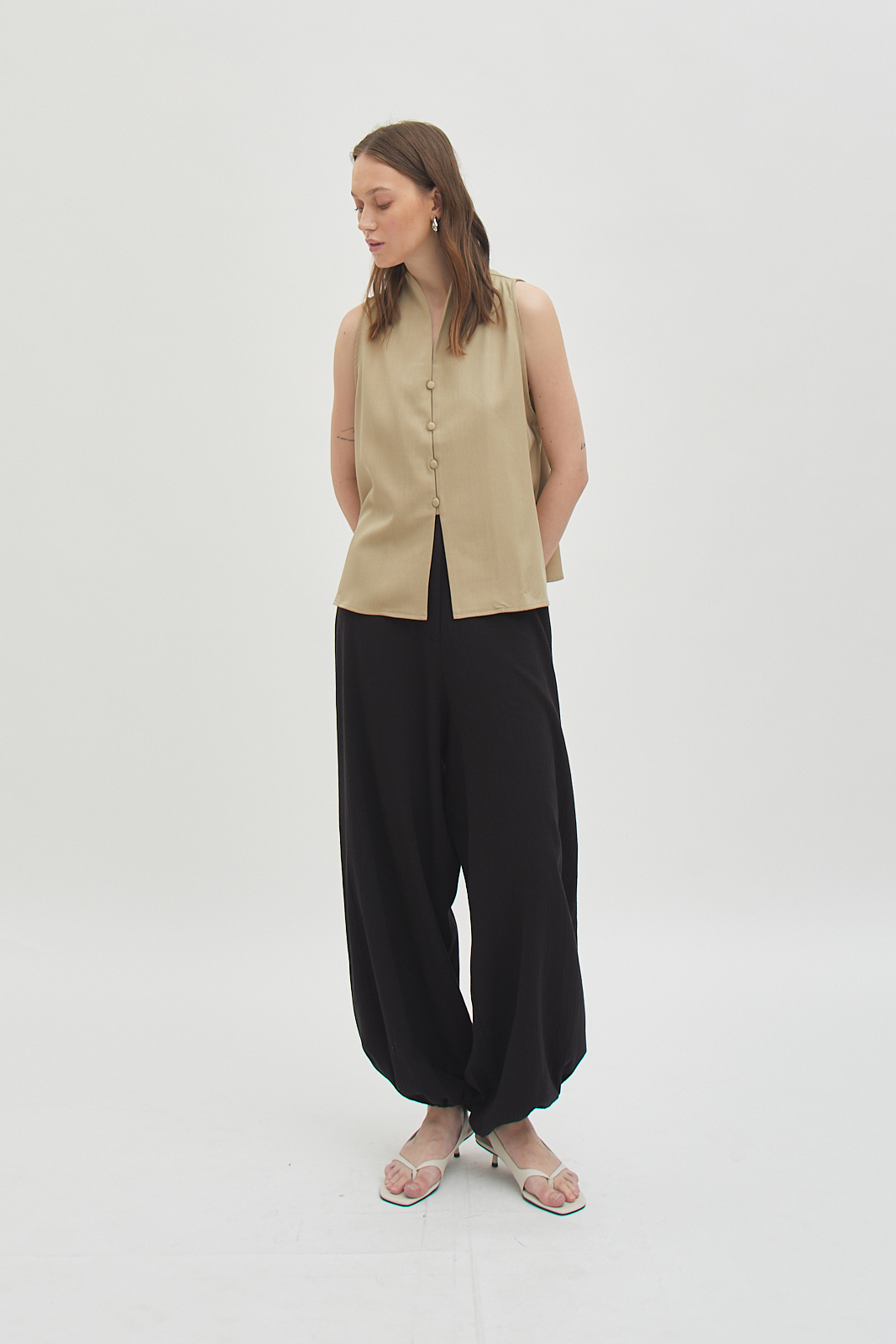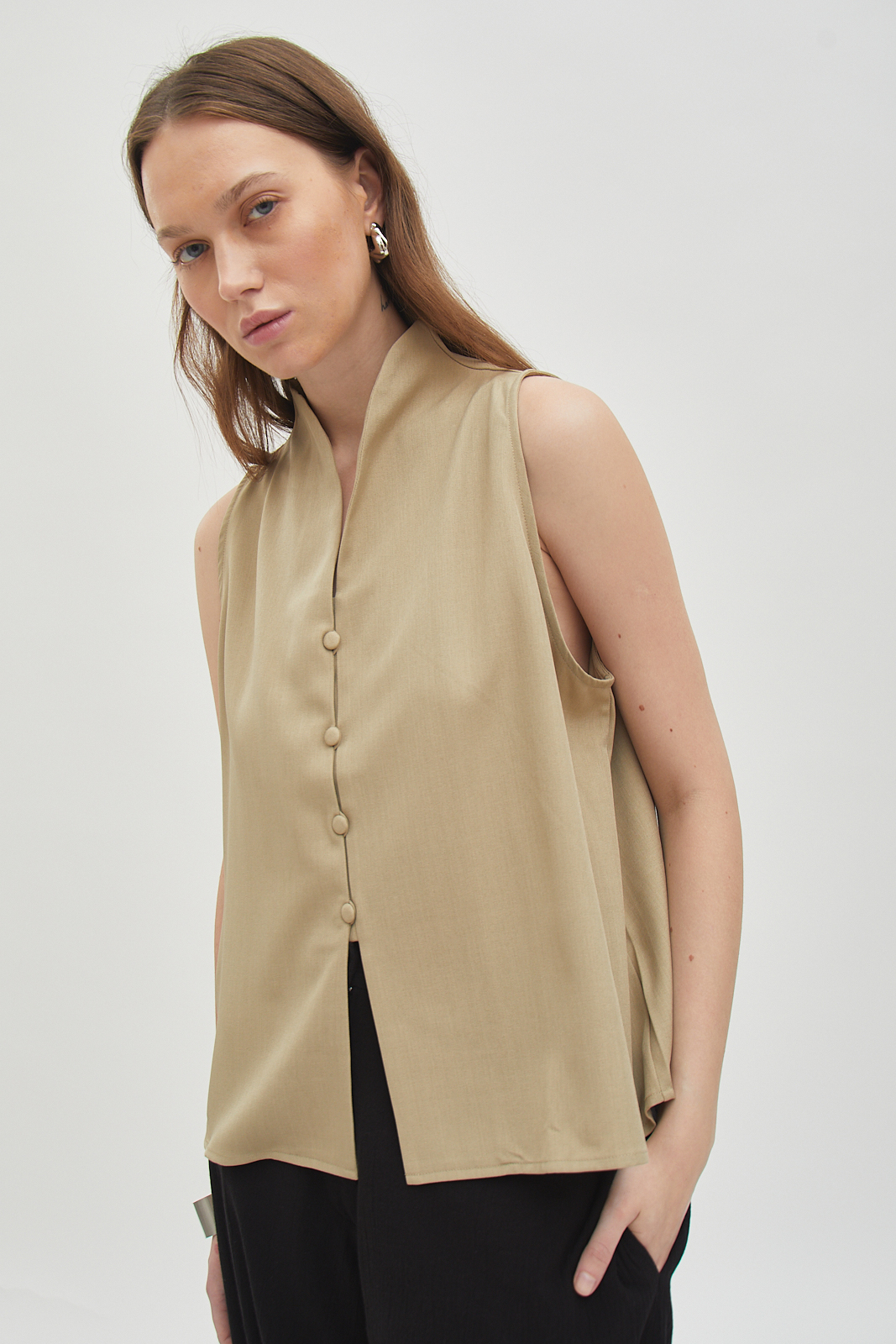 Sleeveless button-front top with a relaxed, straight cut.