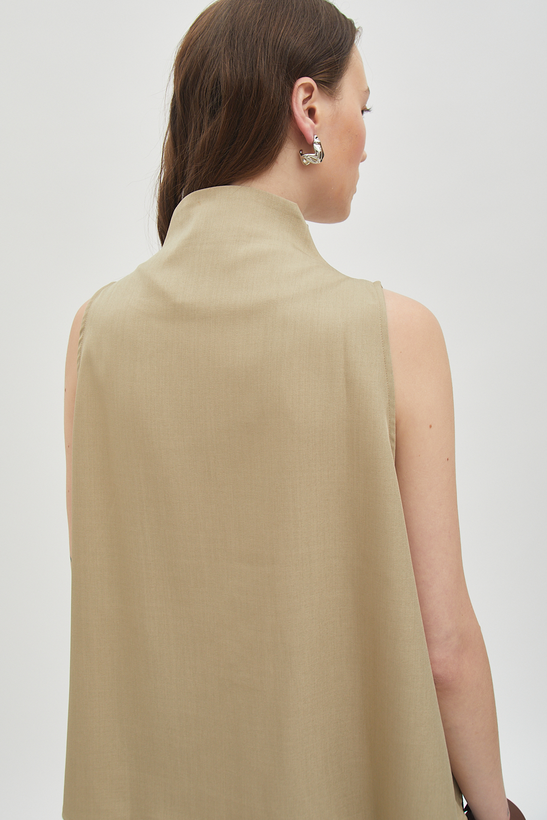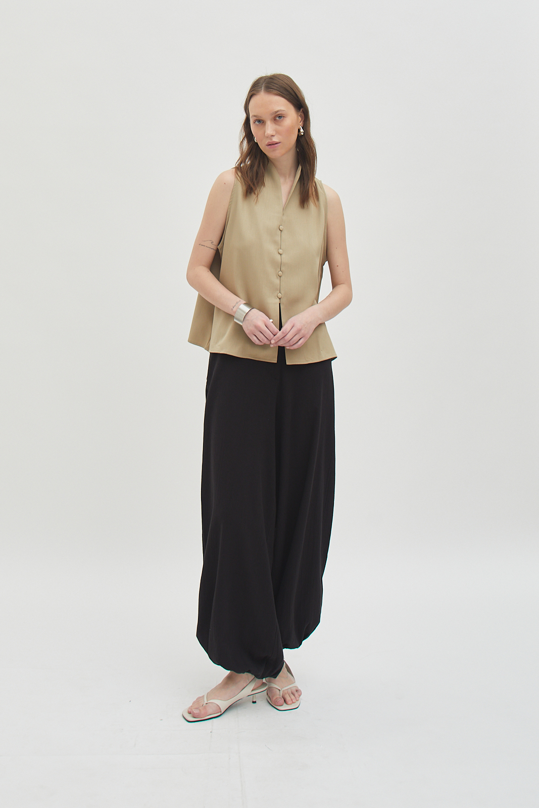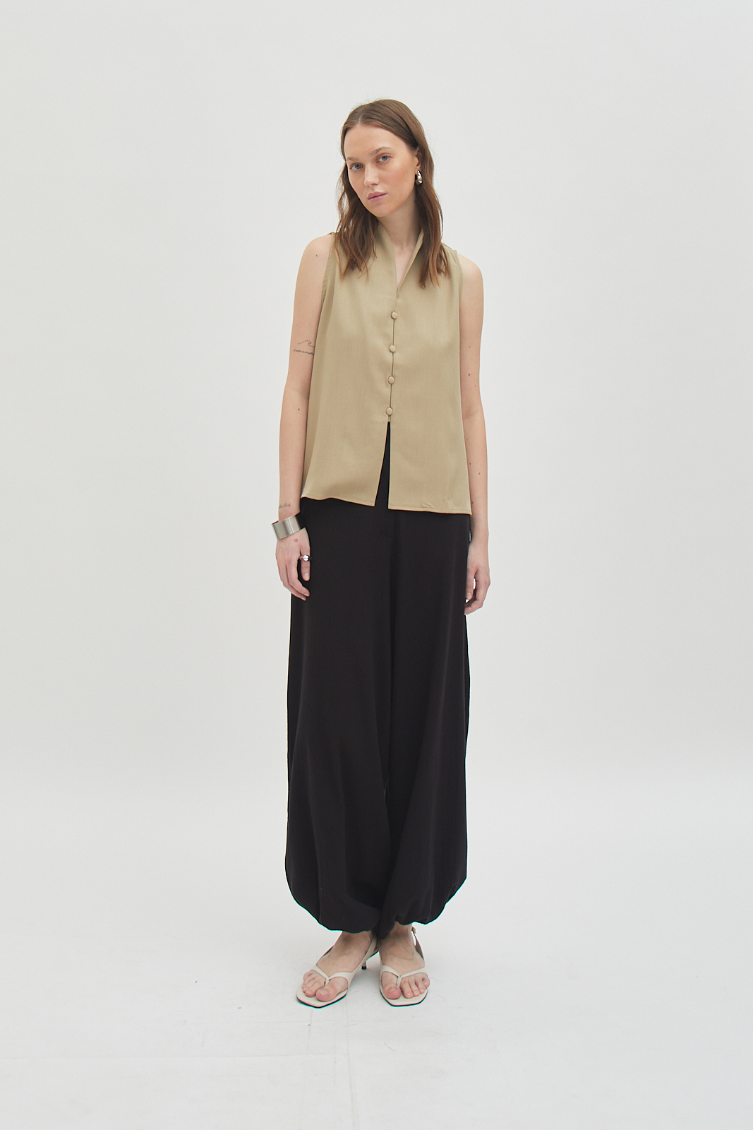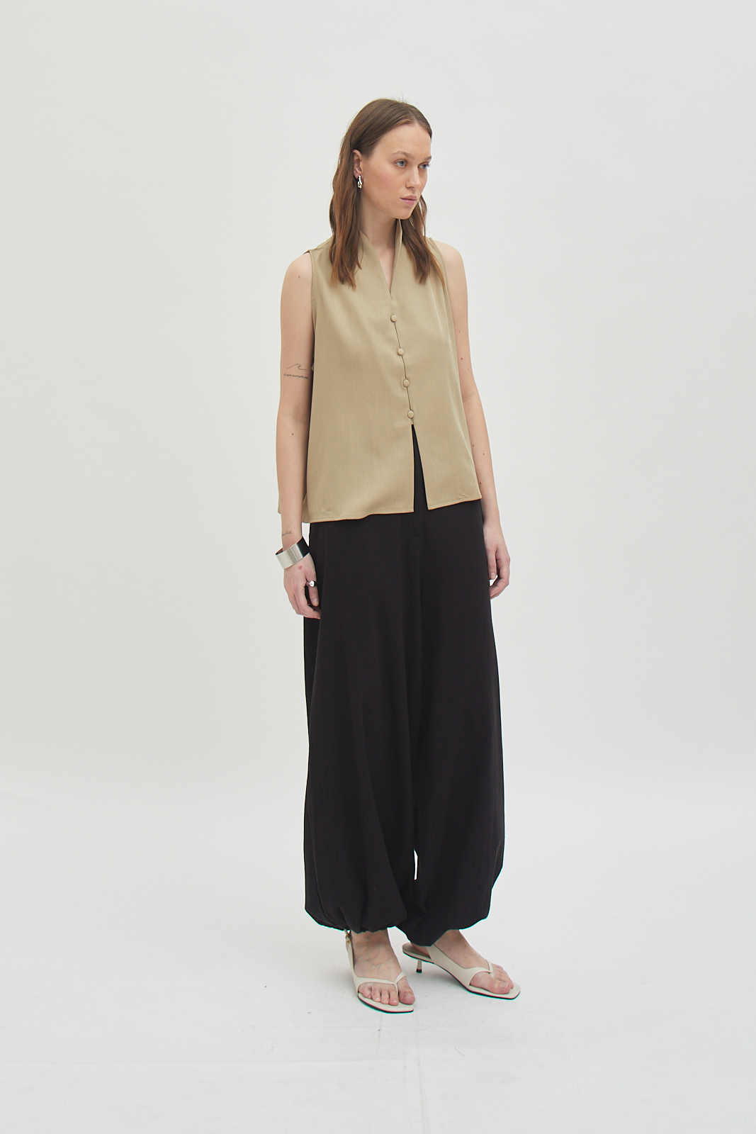 Sleeveless button-front top with a relaxed, straight cut.