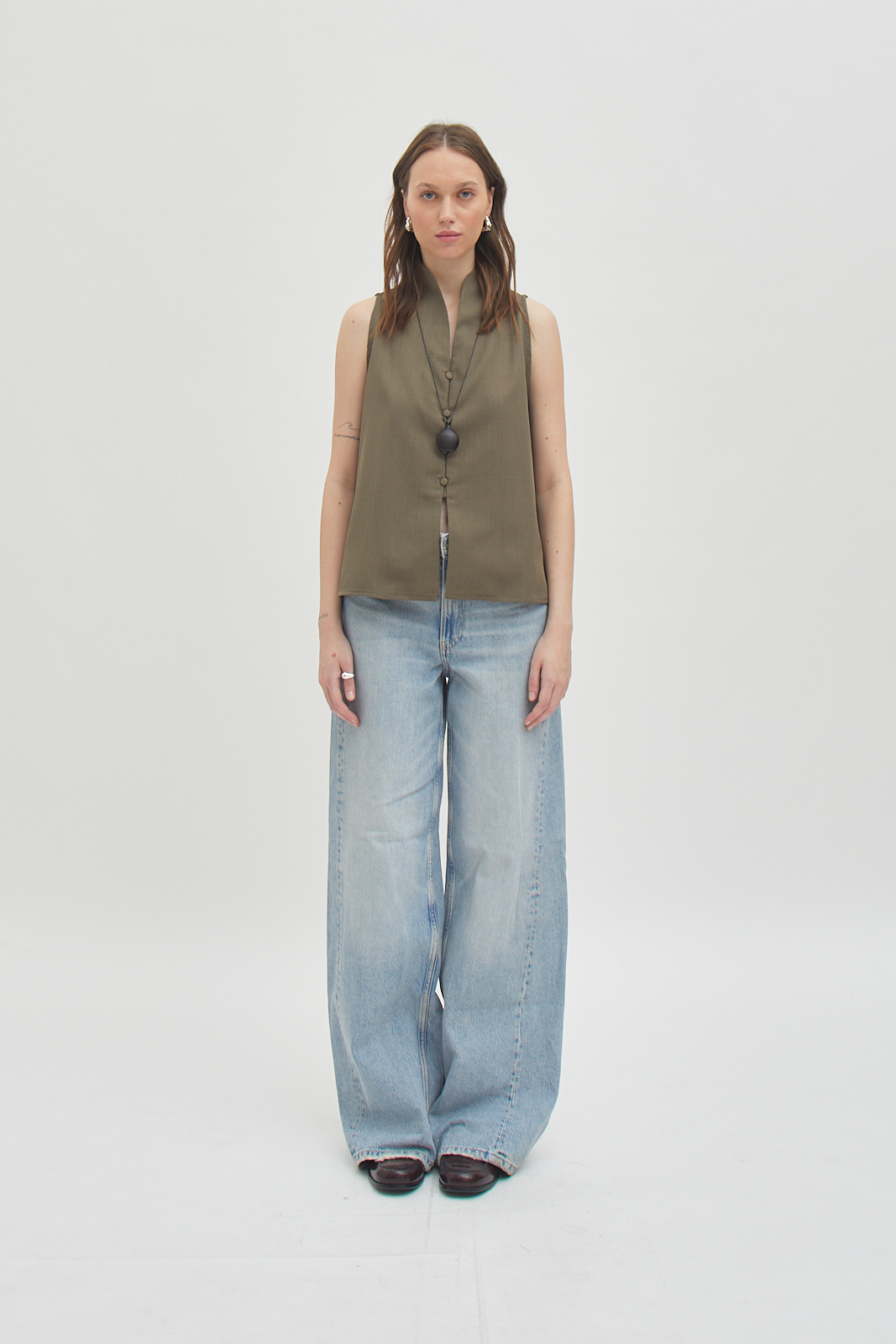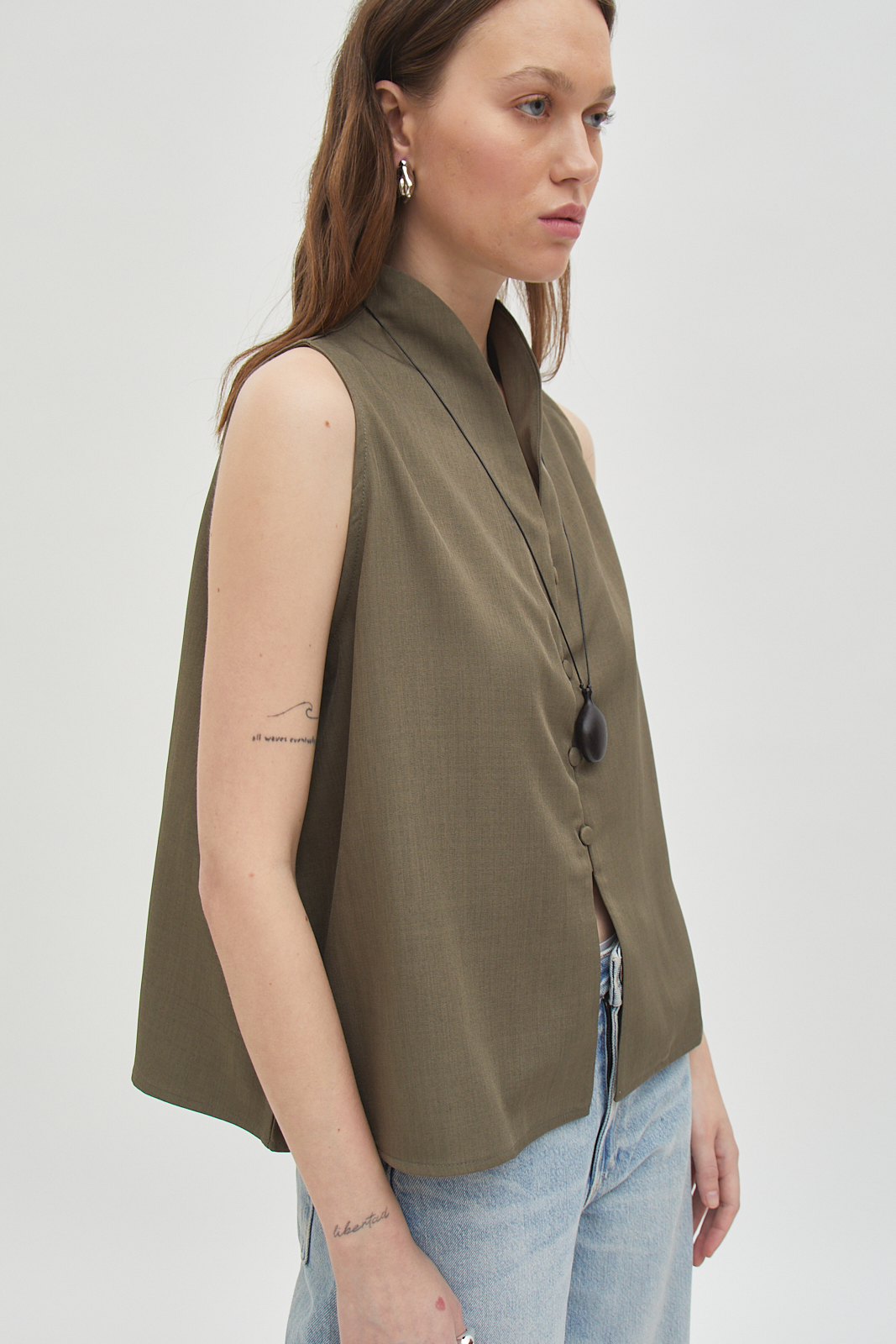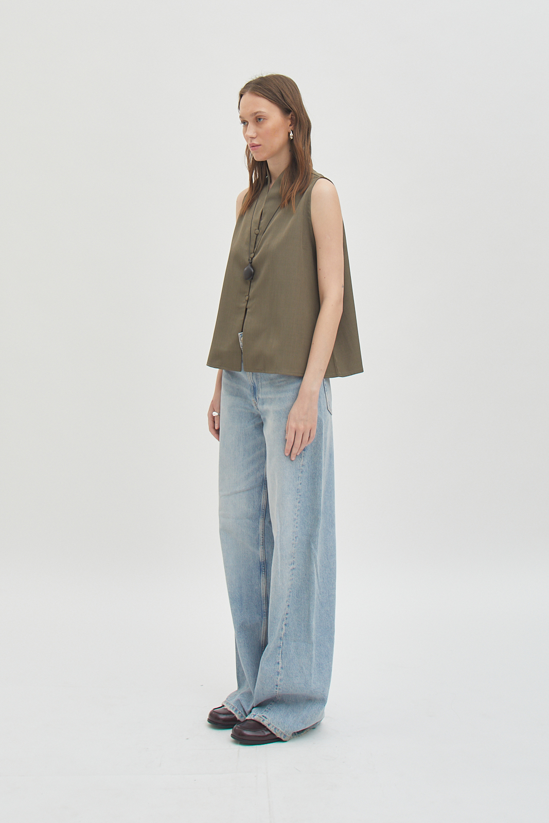 V-neckline with fabric-covered buttons. Slightly loose fit for ease.