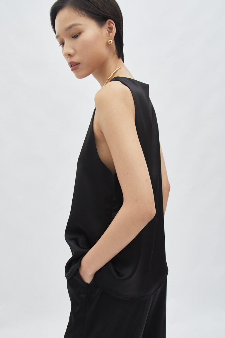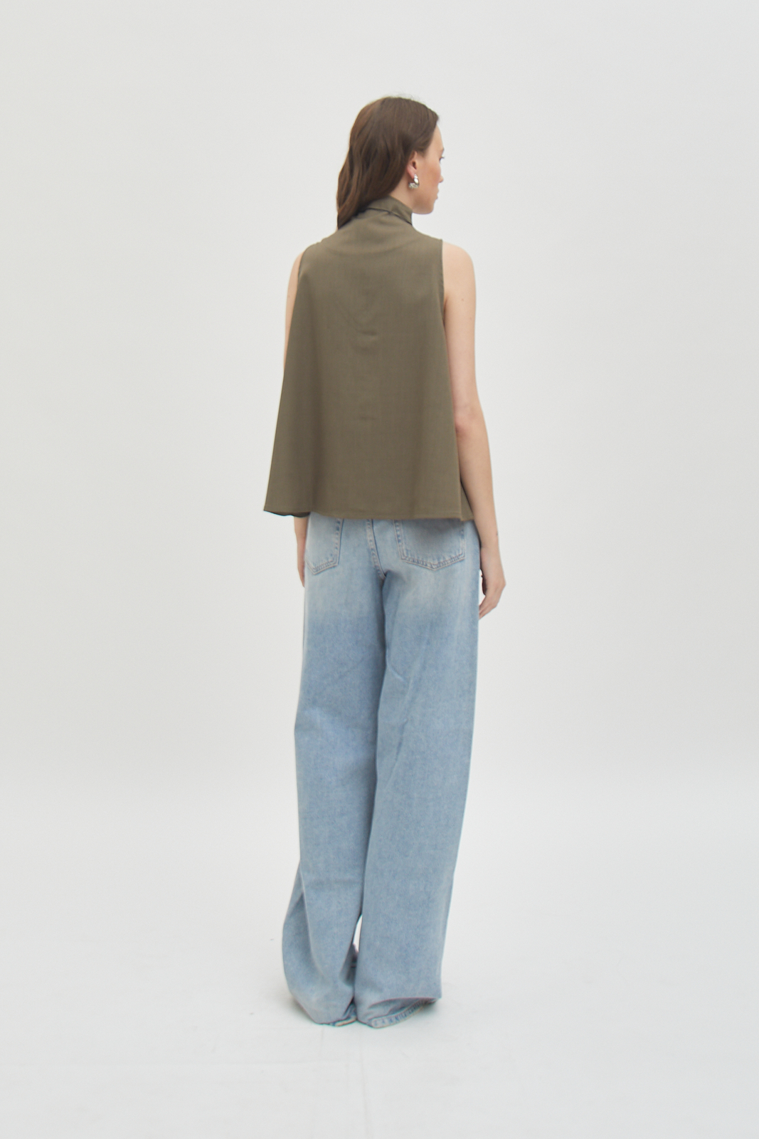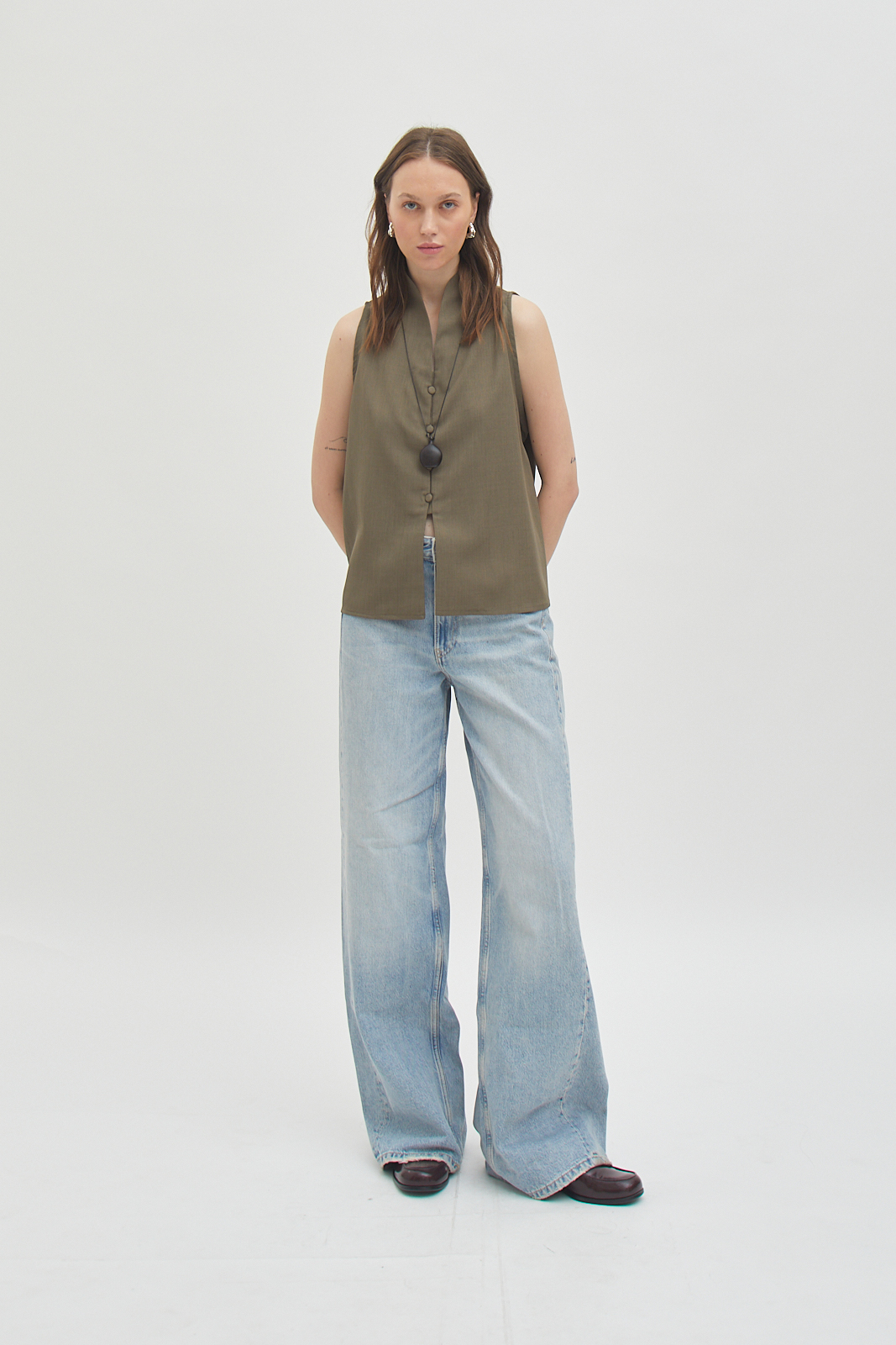 V-neckline with fabric-covered buttons. Slightly loose fit for ease.