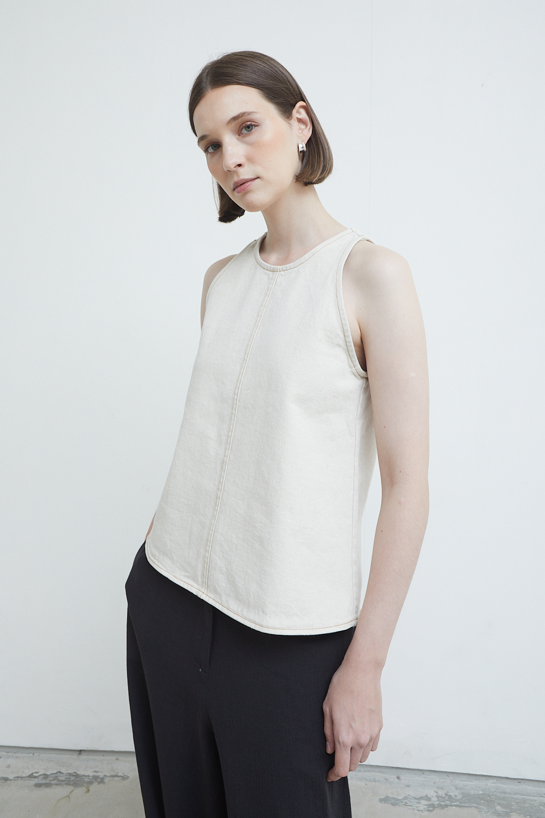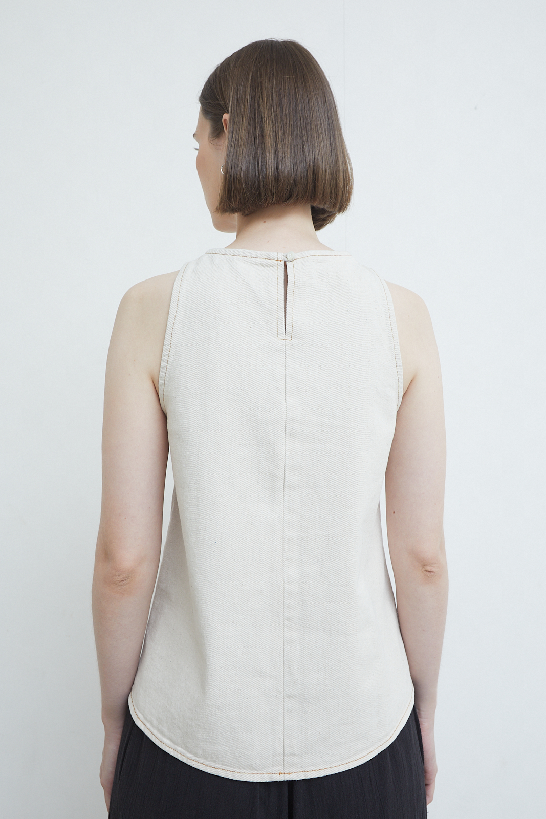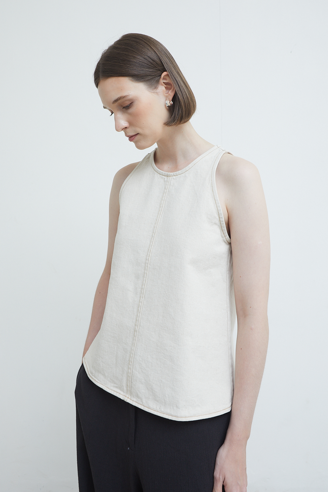 Slim-cut tank in washed canvas with a structured yet softened feel. Designed with a clean neckline and a central seam detail that subtly shapes the body. Minimal, grounded, and easy to layer or wear on its own.