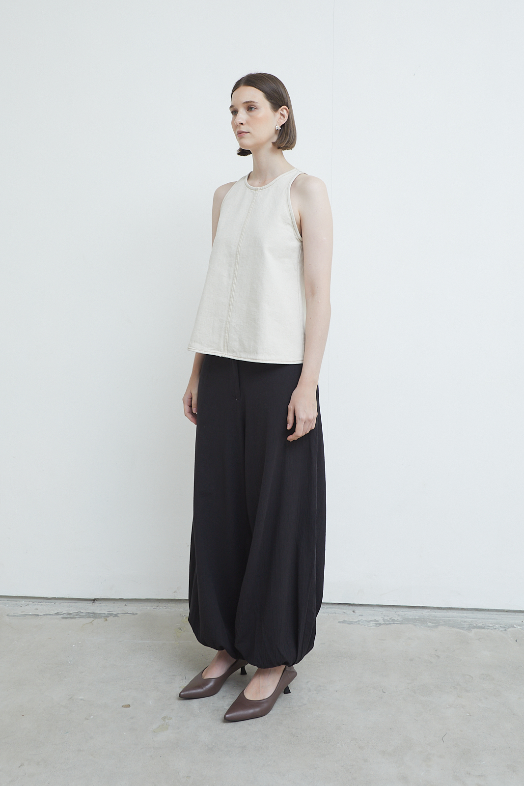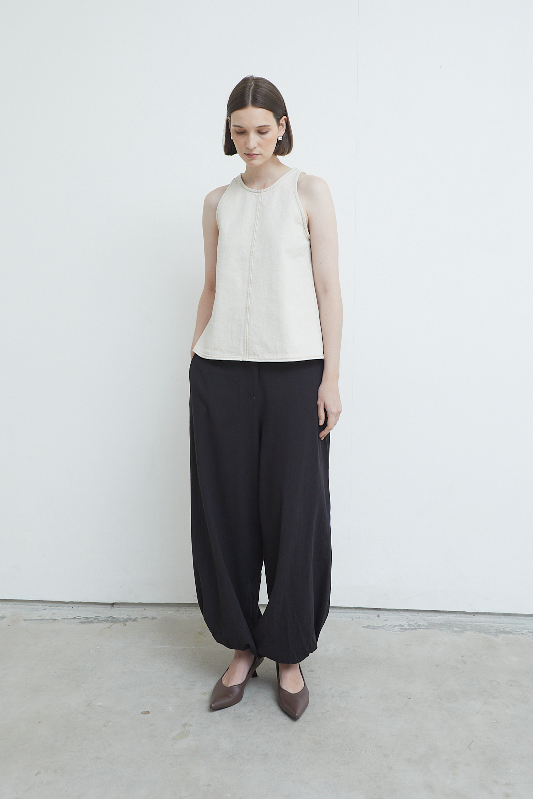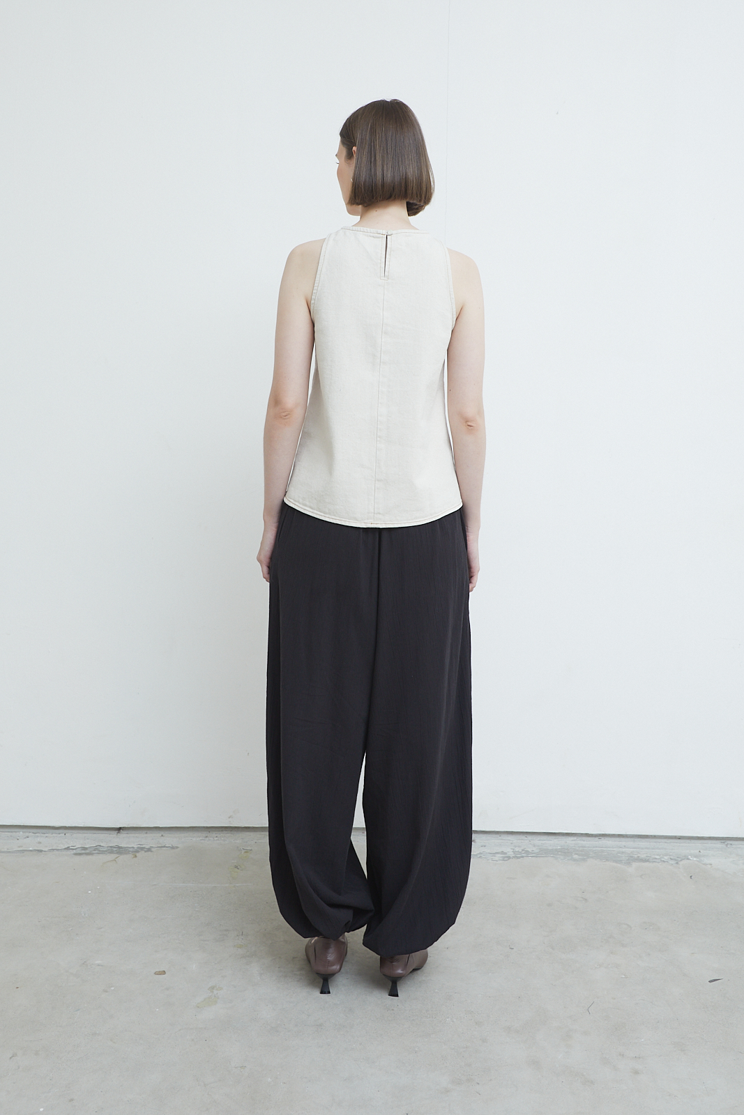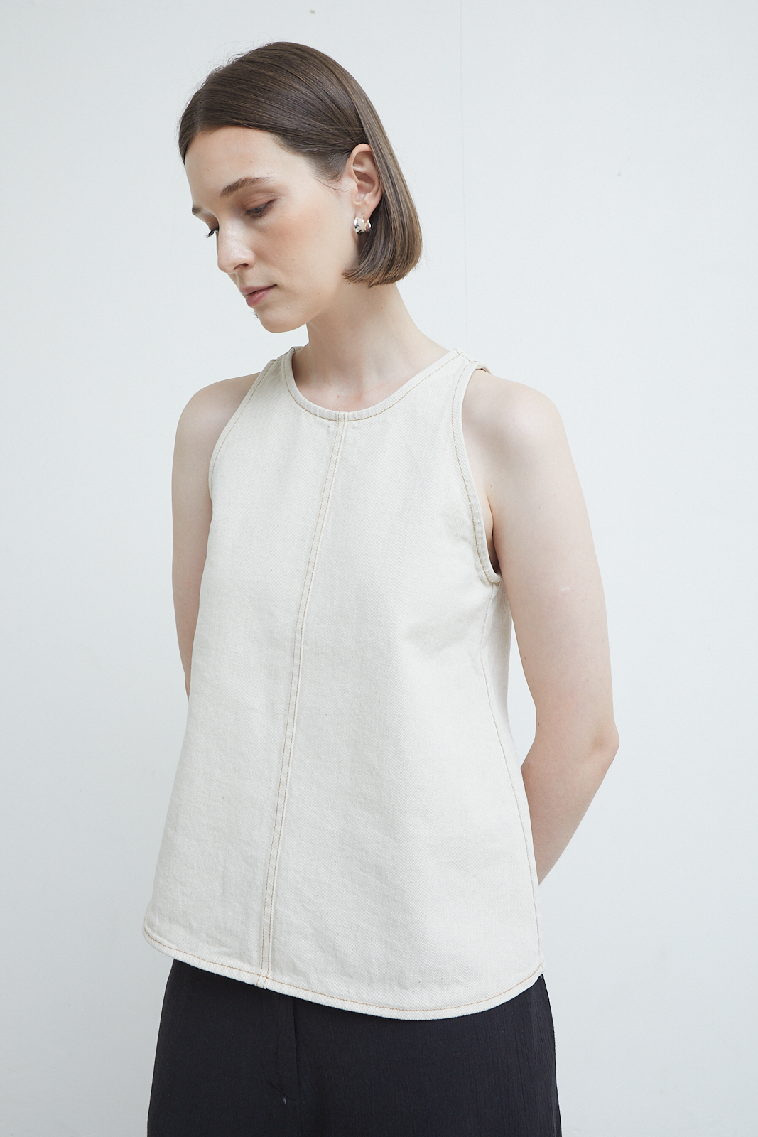 Slim-cut tank in washed canvas with a structured yet softened feel. Designed with a clean neckline and a central seam detail that subtly shapes the body. Minimal, grounded, and easy to layer or wear on its own.
