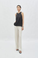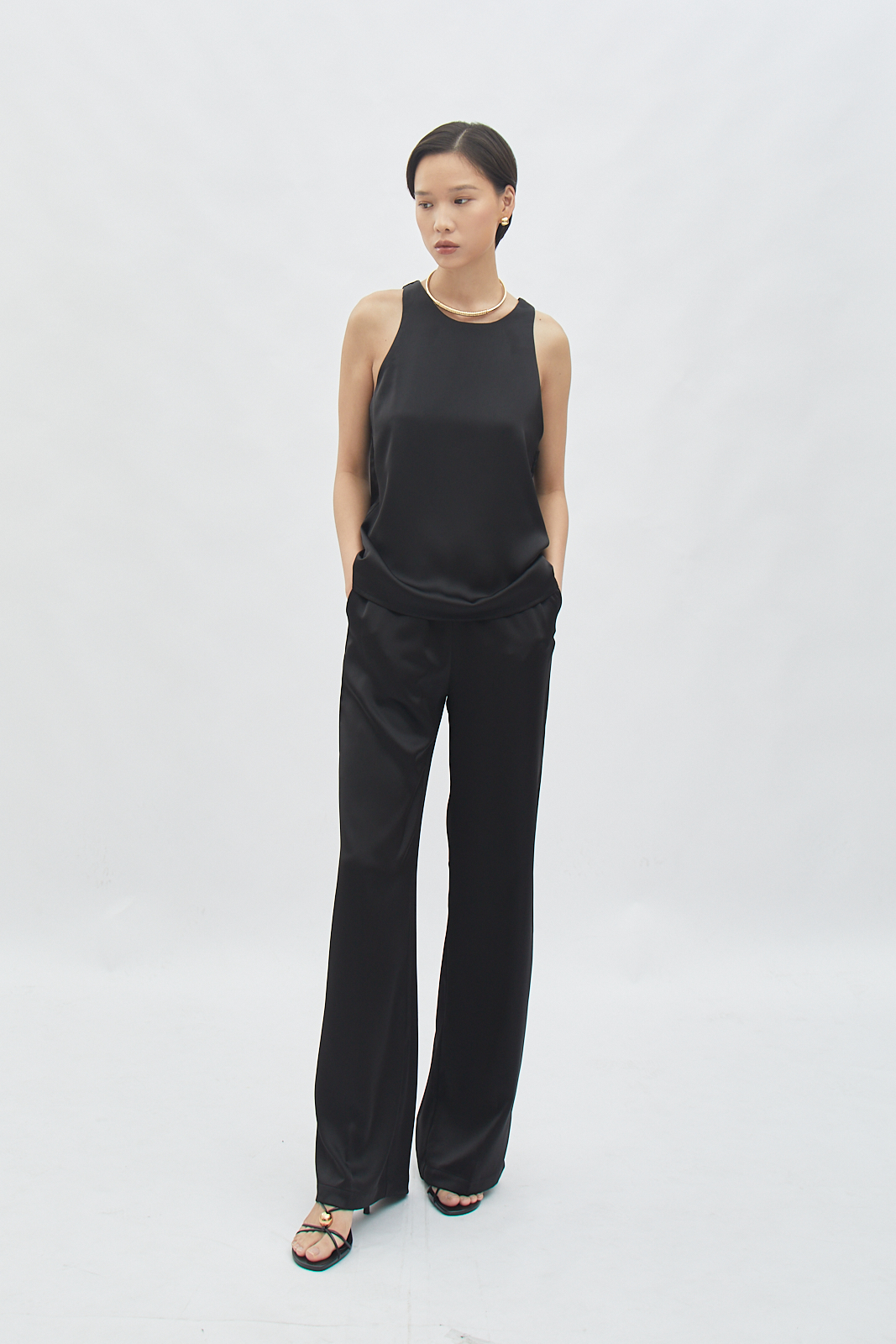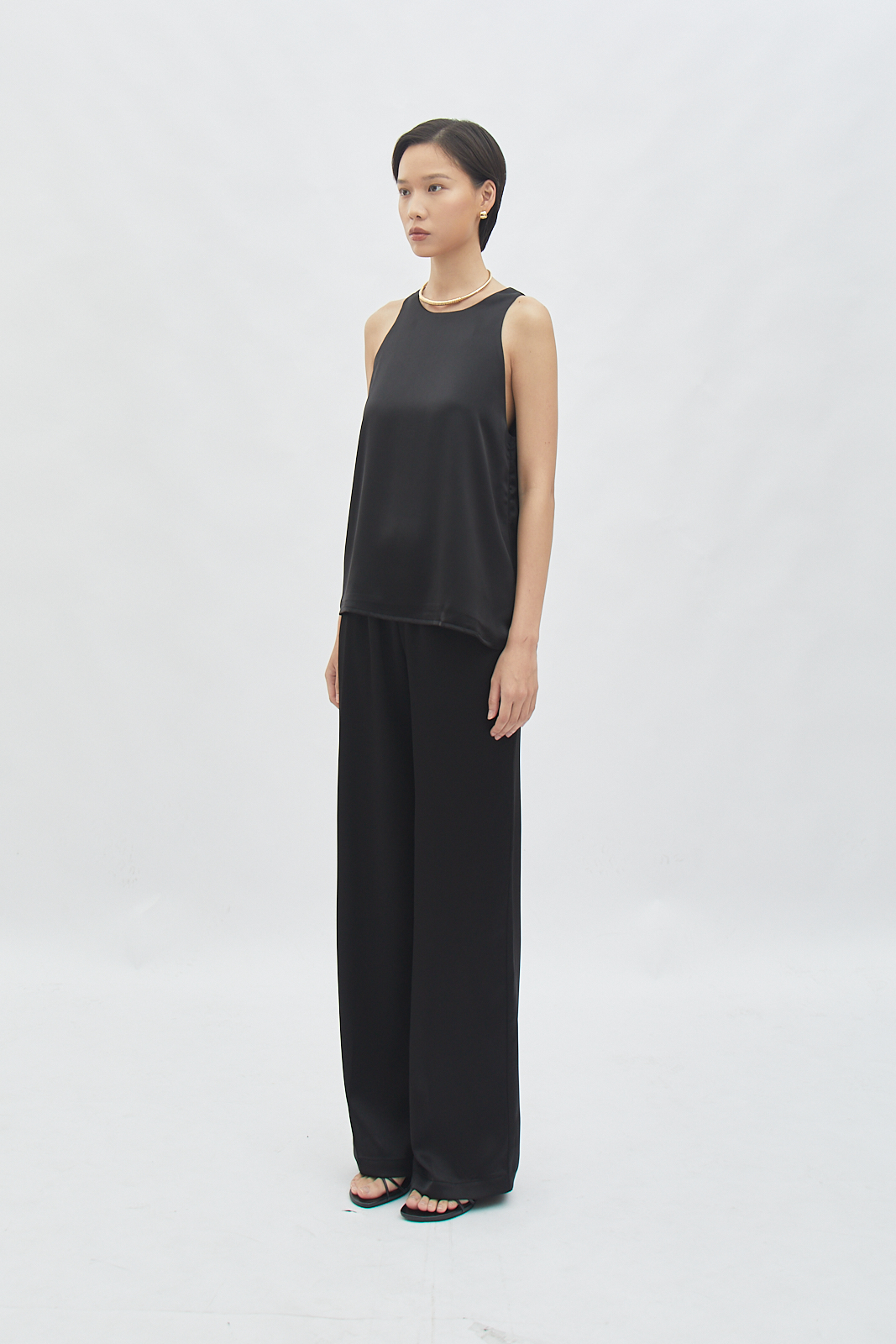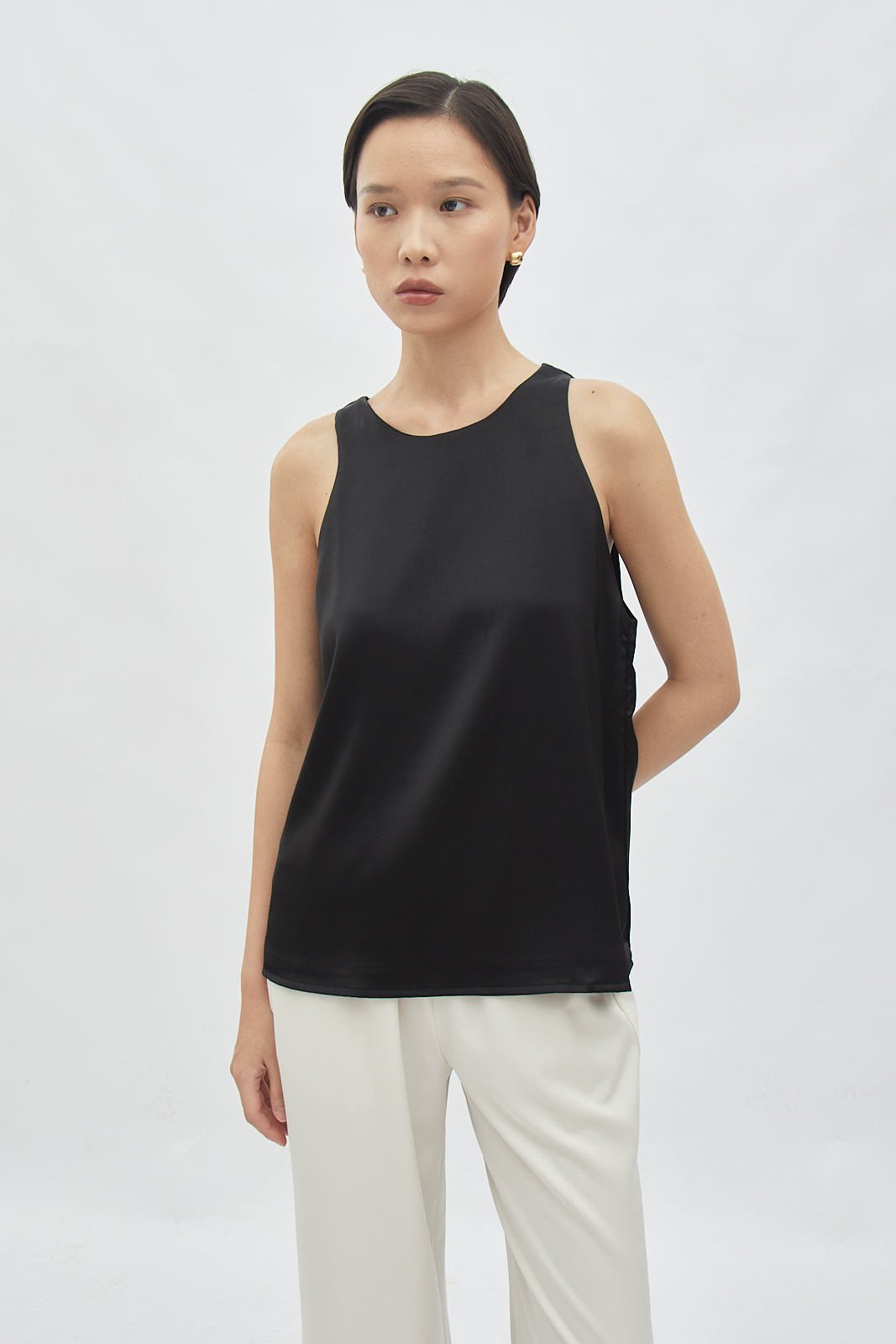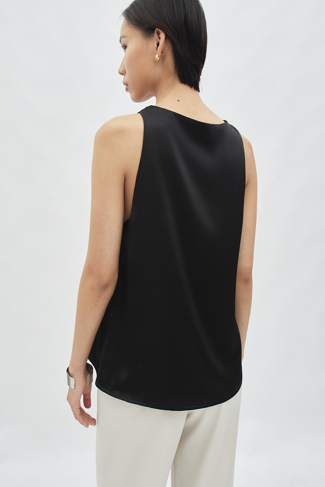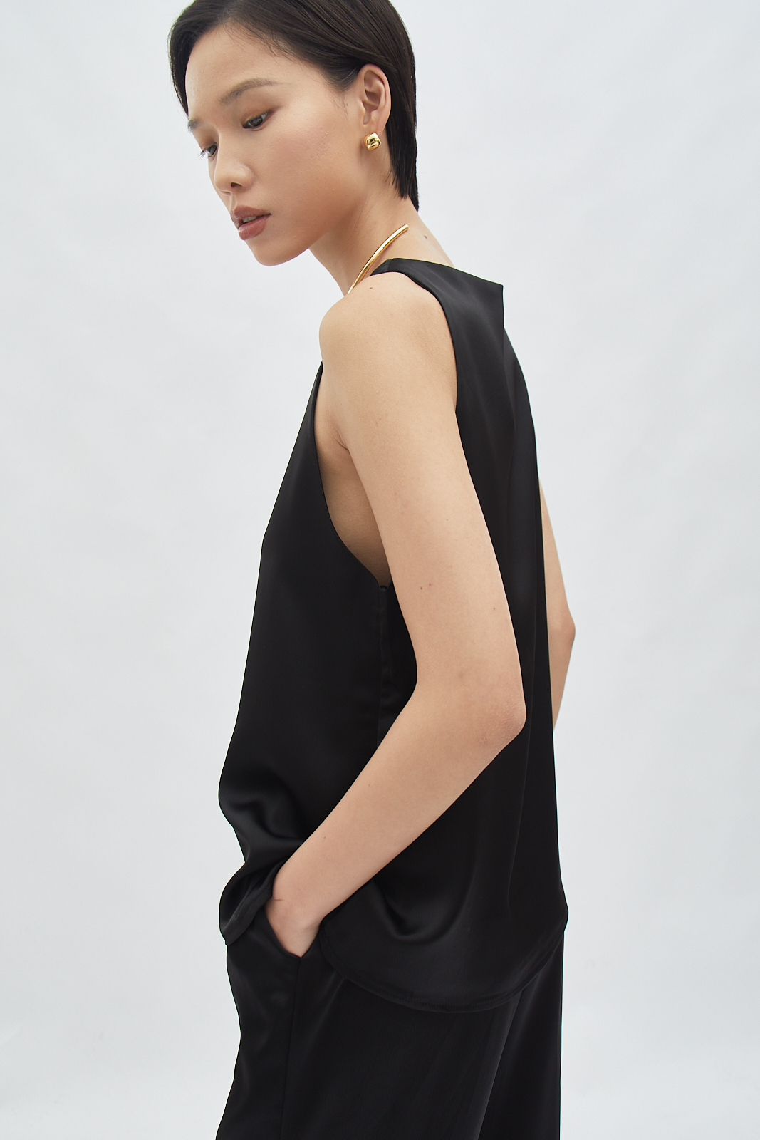Minimal tank crafted from dense sateen, structured yet fluid against the body. Clean neckline and cutaway shoulders offer a sharp, understated line—perfect worn alone or layered.