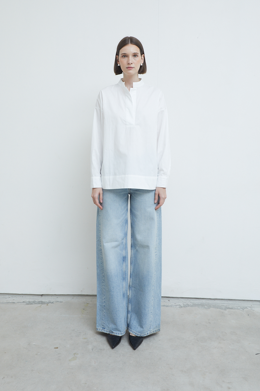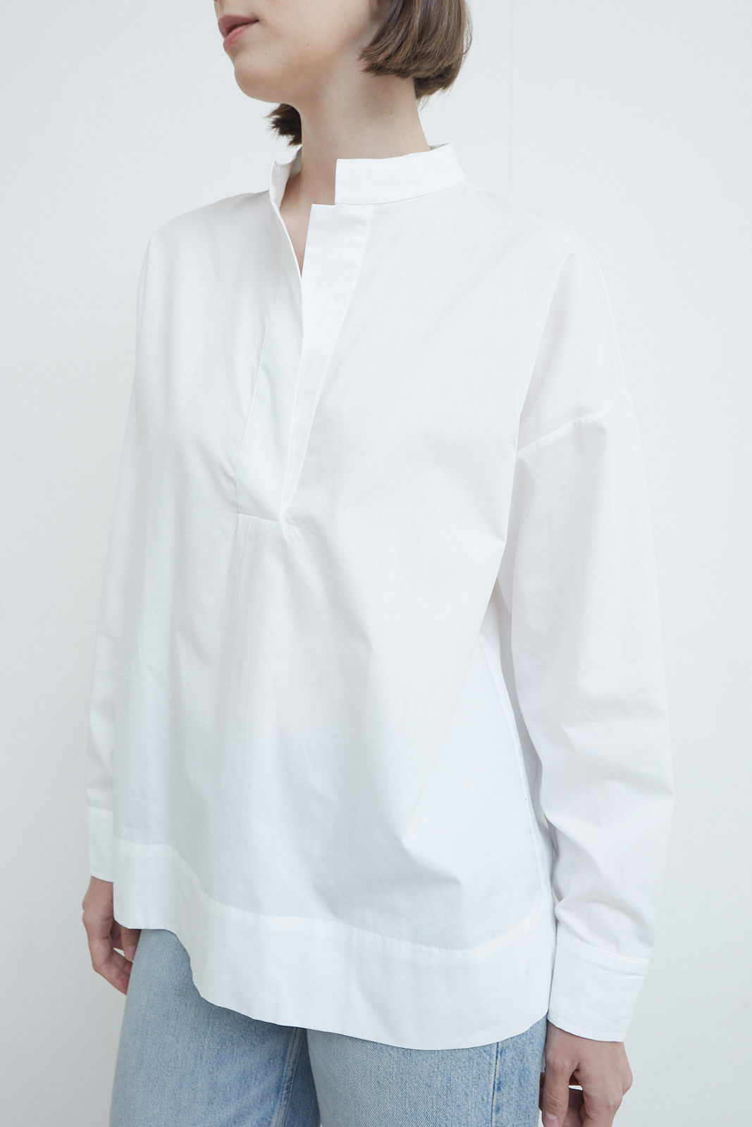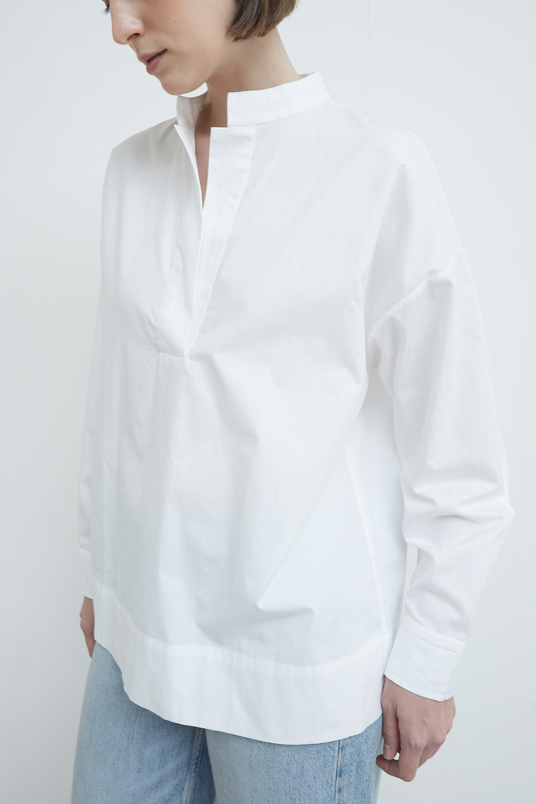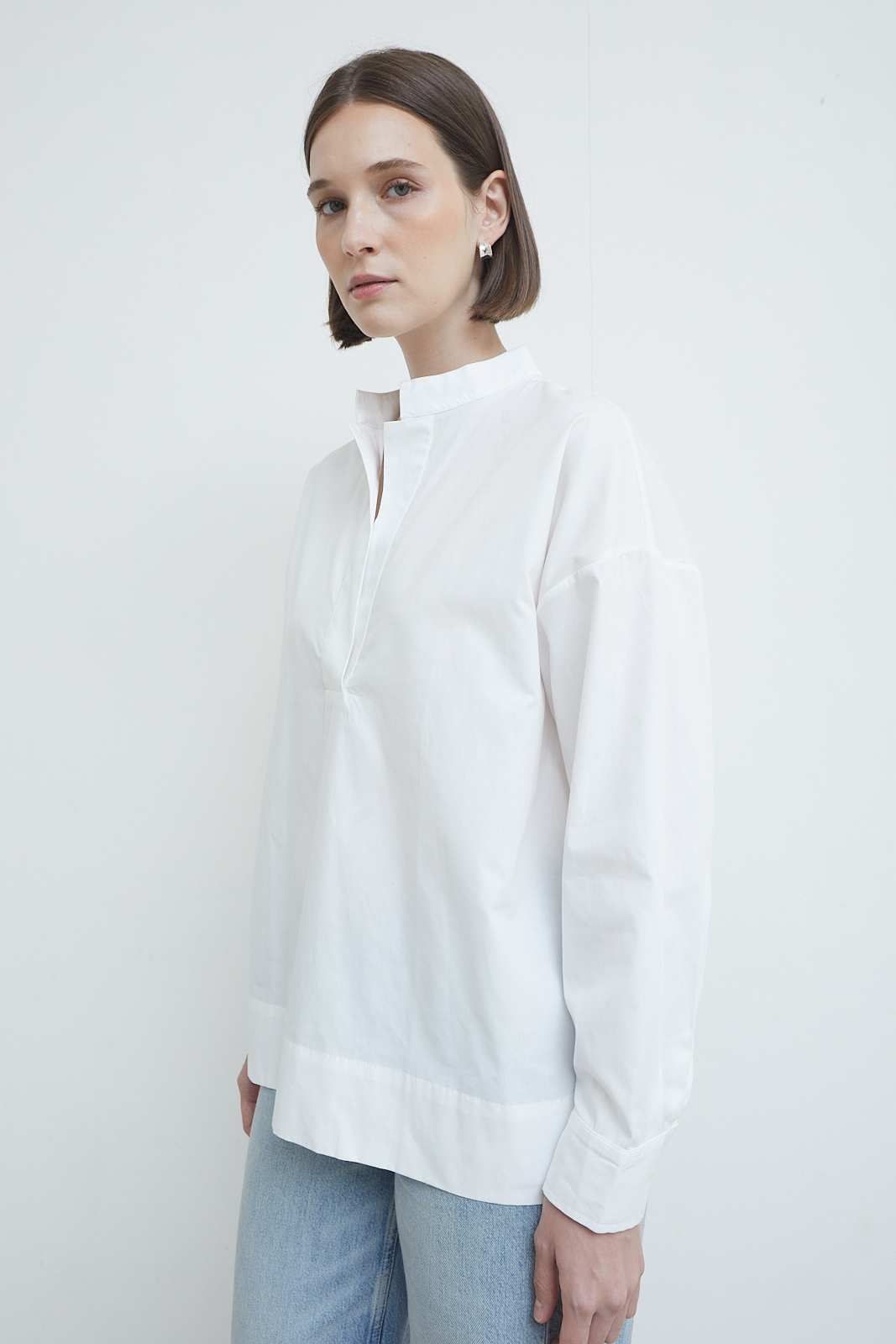 A refined everyday blouse defined by its clean front and softly structured neckline. Designed with a subtle standing collar and a concealed placket, it creates a quiet, uninterrupted line through the body. The relaxed silhouette and extended length offer ease without losing form, making it a versatile piece that balances sharpness with softness.