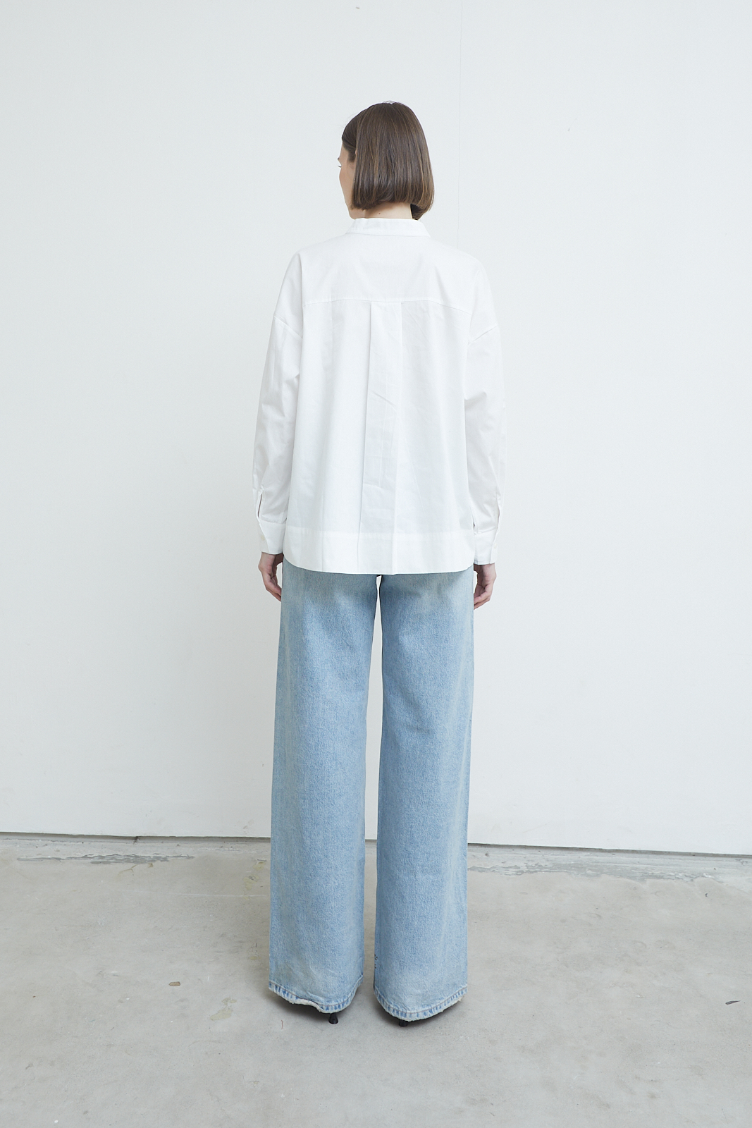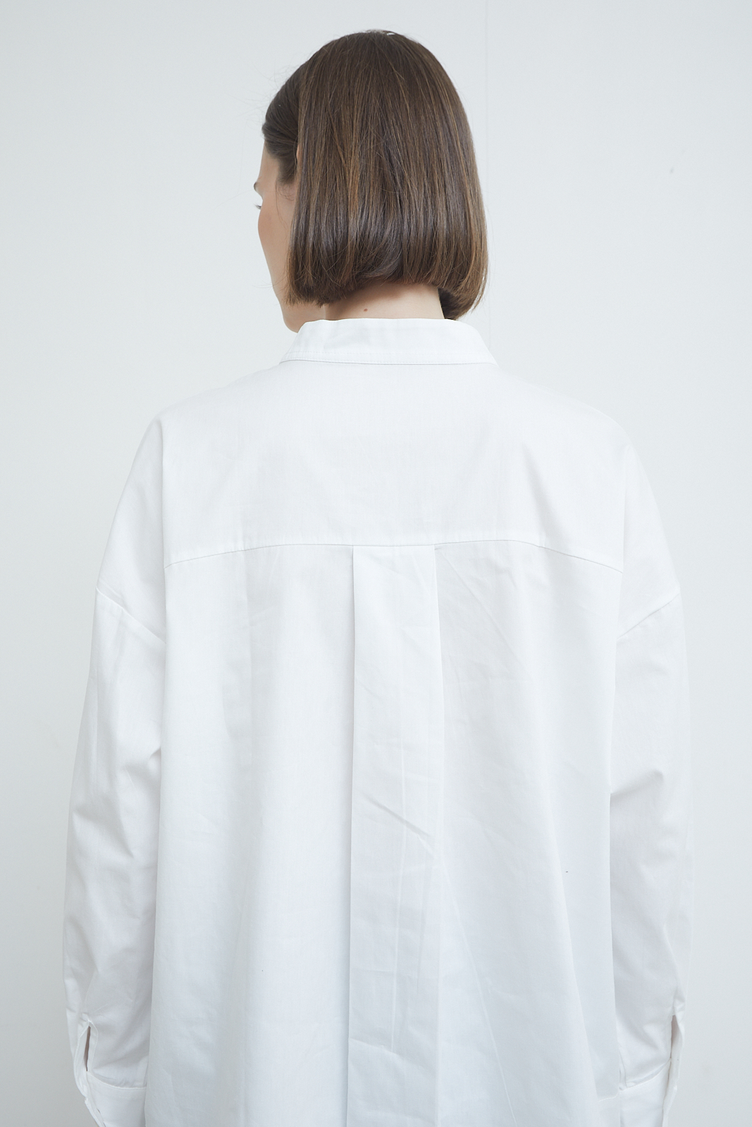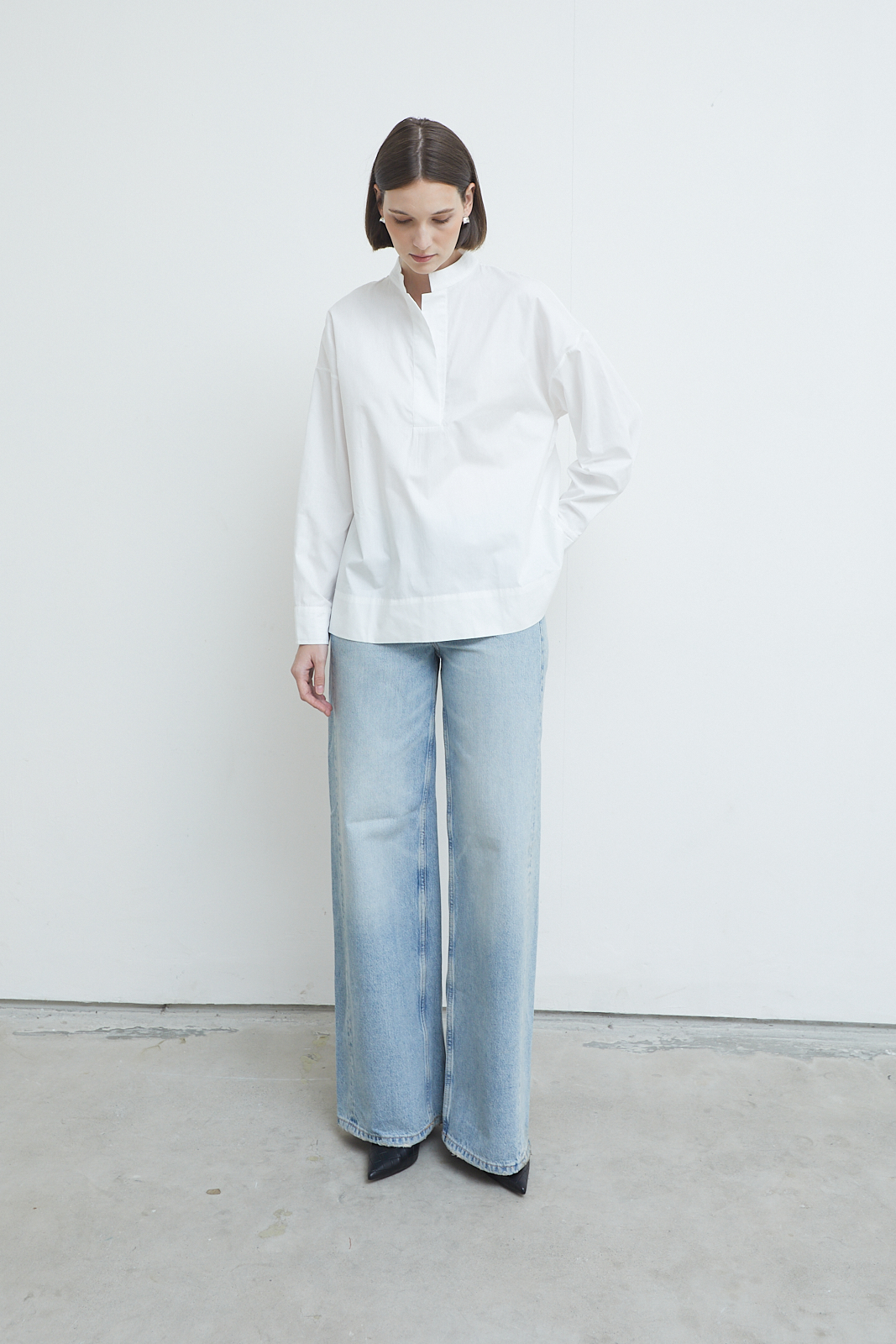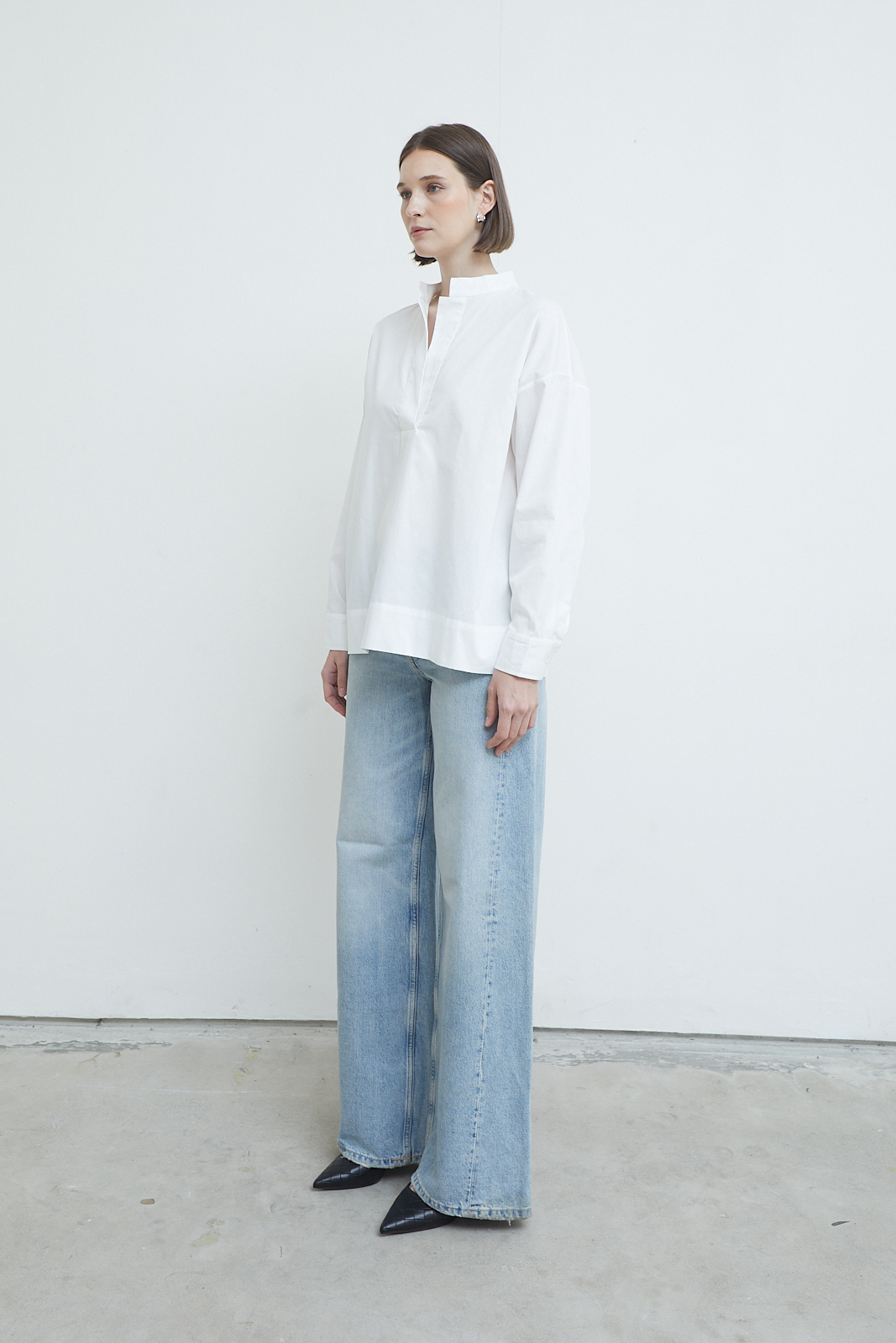 A refined everyday blouse defined by its clean front and softly structured neckline. Designed with a subtle standing collar and a concealed placket, it creates a quiet, uninterrupted line through the body. The relaxed silhouette and extended length offer ease without losing form, making it a versatile piece that balances sharpness with softness.
