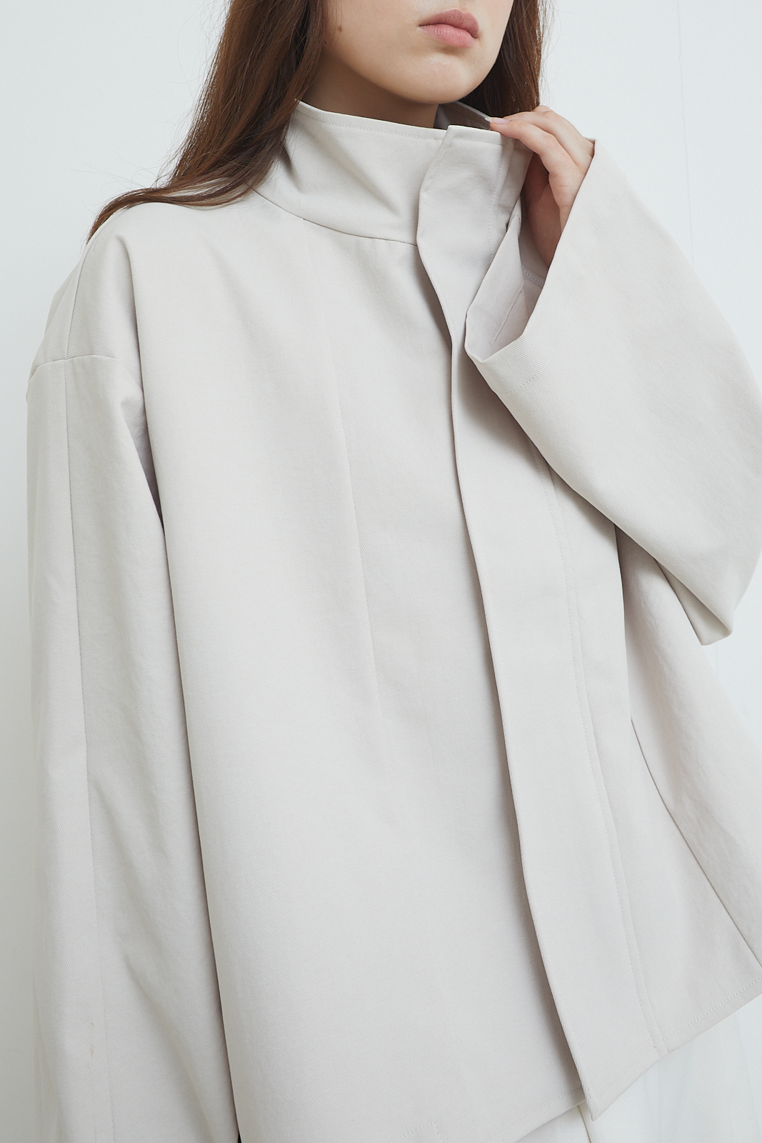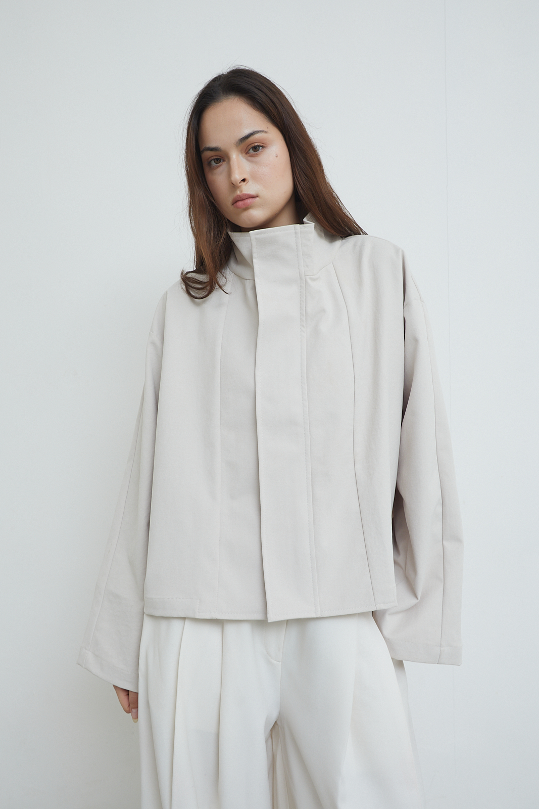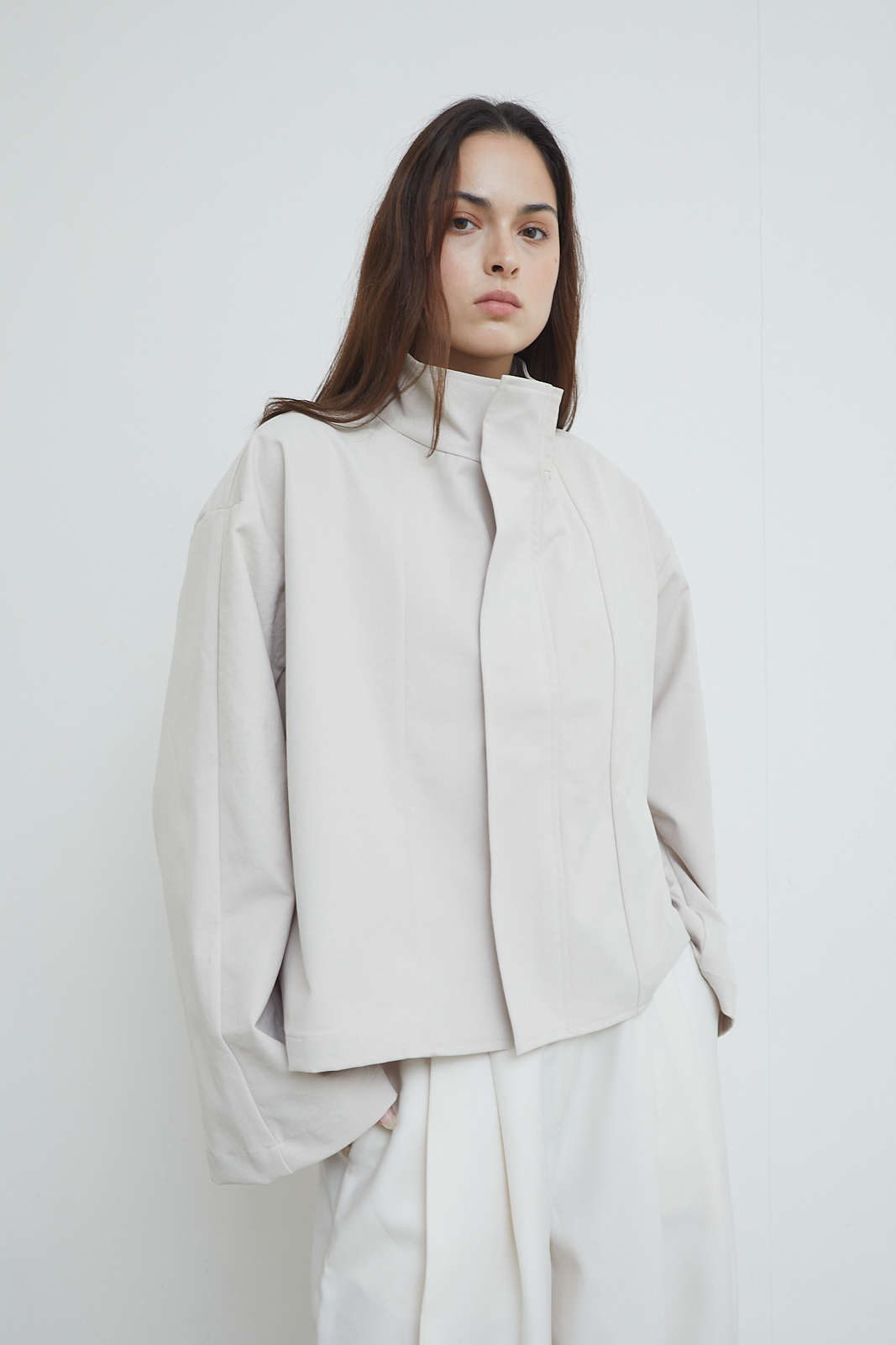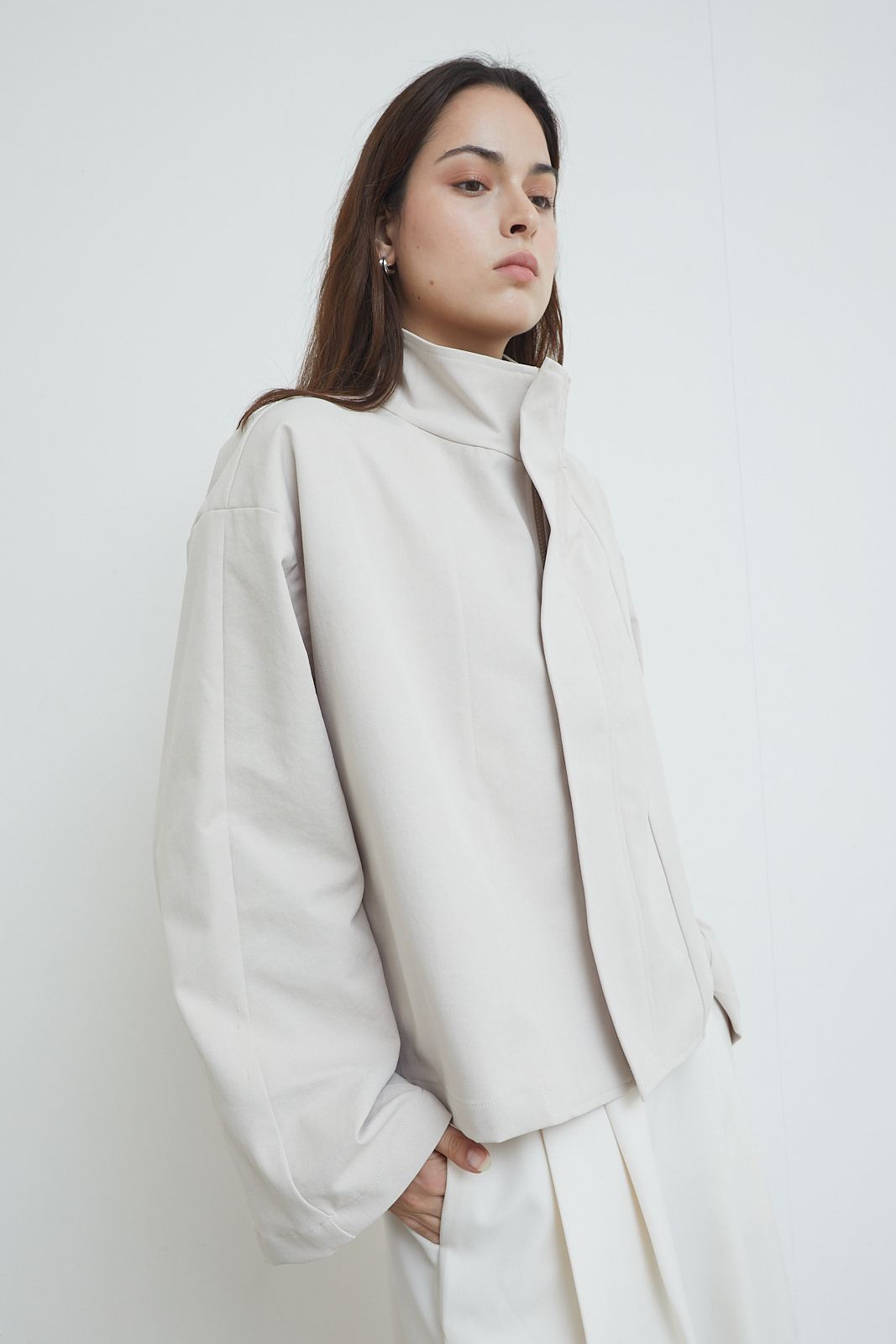 Structured jacket with a relaxed, boxy cut. Clean front with hidden zip closure and high stand collar. Minimal lines with a firm, smooth handfeel. Designed to hold shape while staying easy to wear.