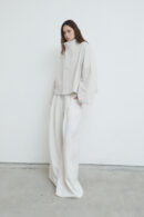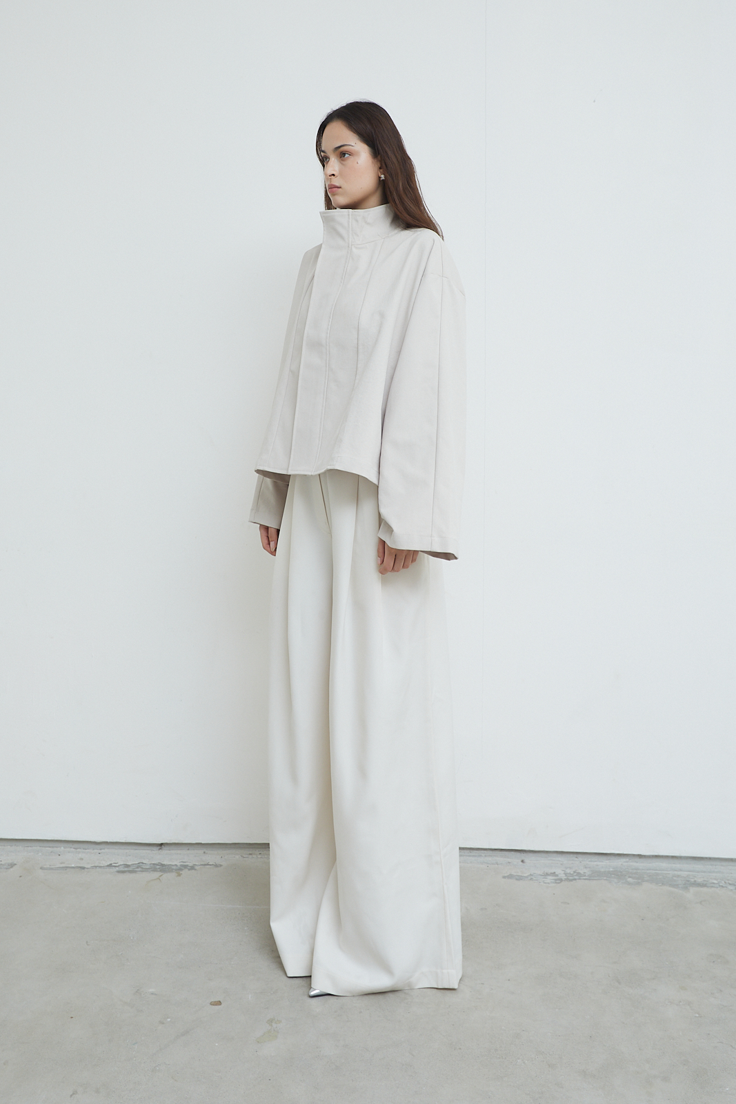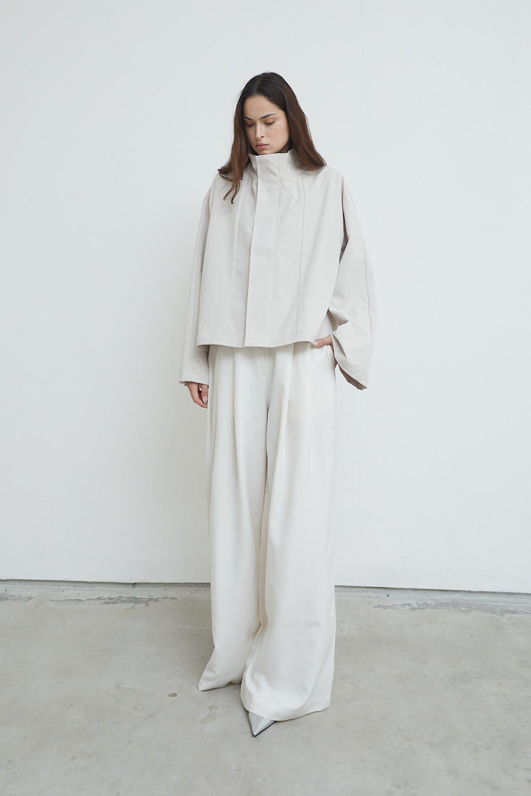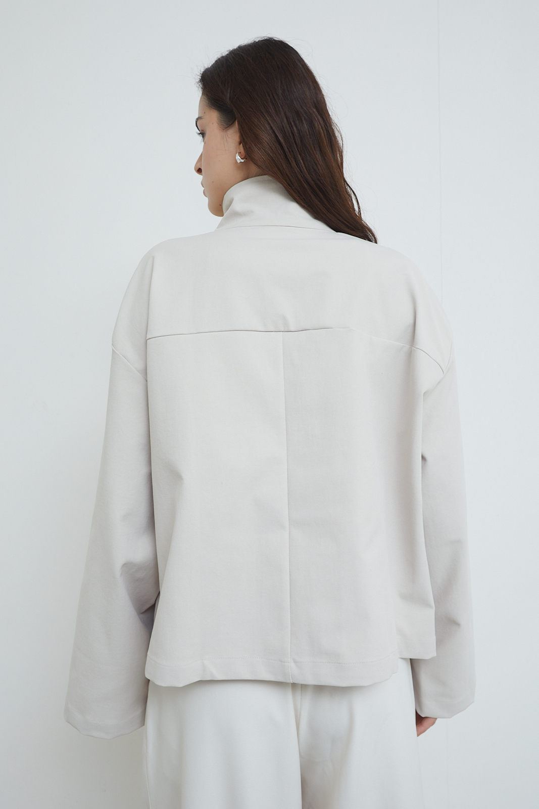 Structured jacket with a relaxed, boxy cut. Clean front with hidden zip closure and high stand collar. Minimal lines with a firm, smooth handfeel. Designed to hold shape while staying easy to wear.