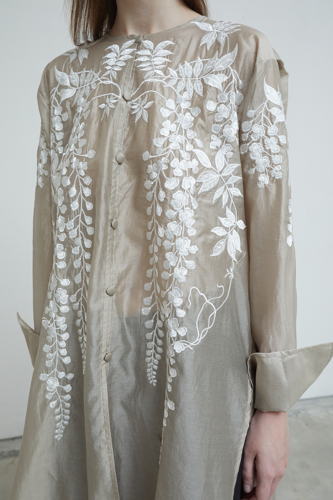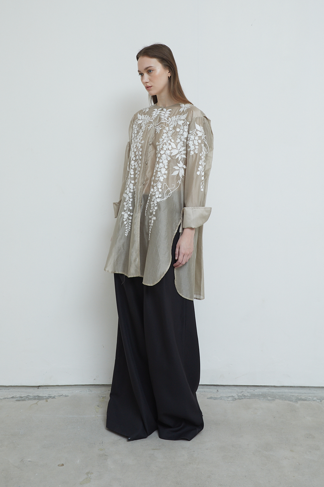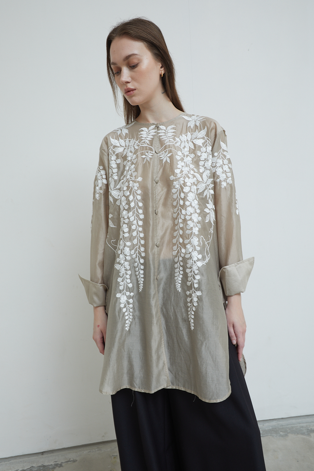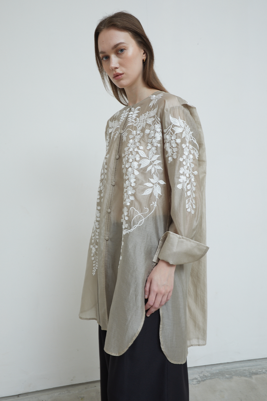 Signature embroidery. Long shirt with a relaxed, flowing cut. Sheer textured fabric with floral embroidery across the front, sleeves, and back. Lightweight and airy, designed to layer easily. Finished with folded cuffs.