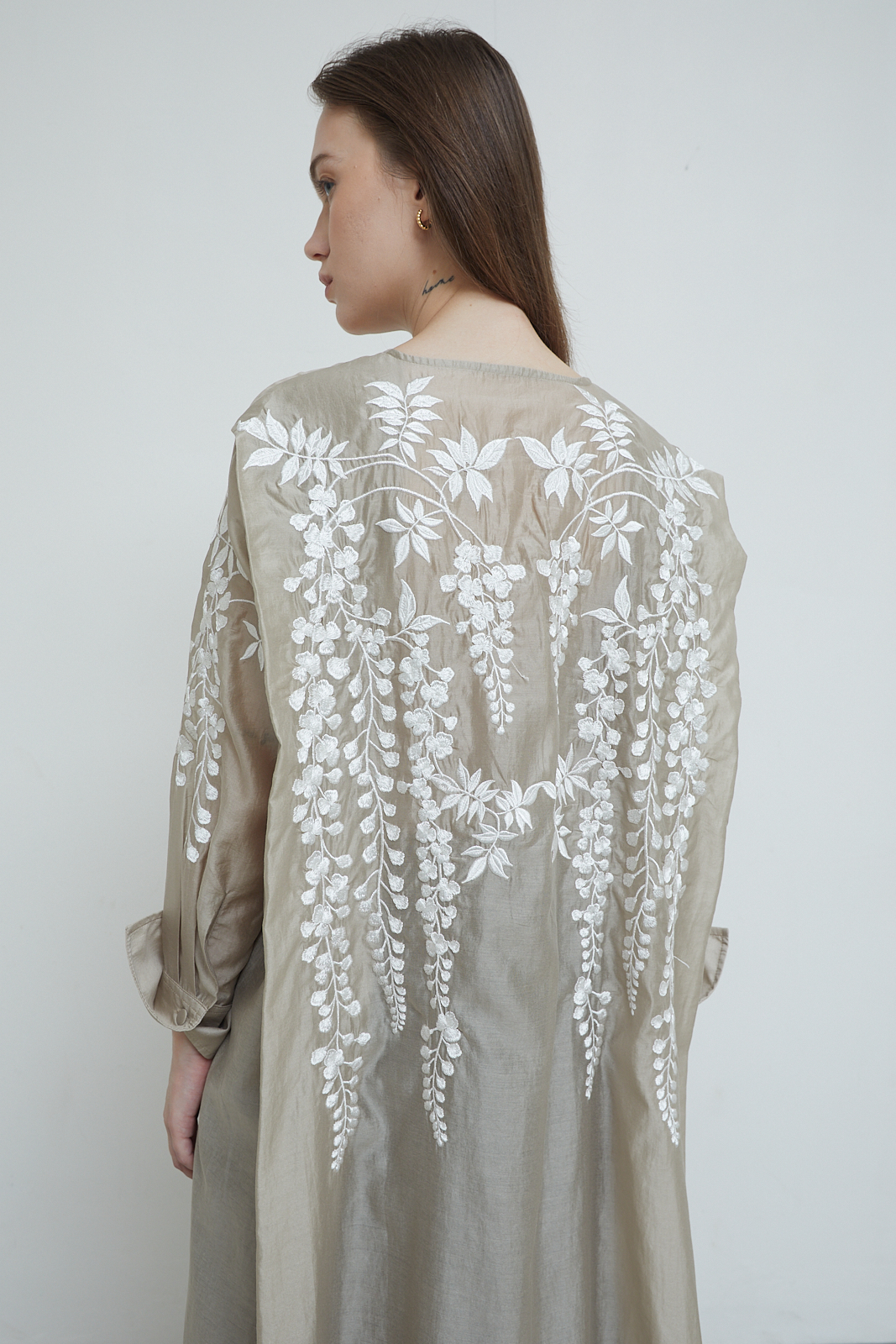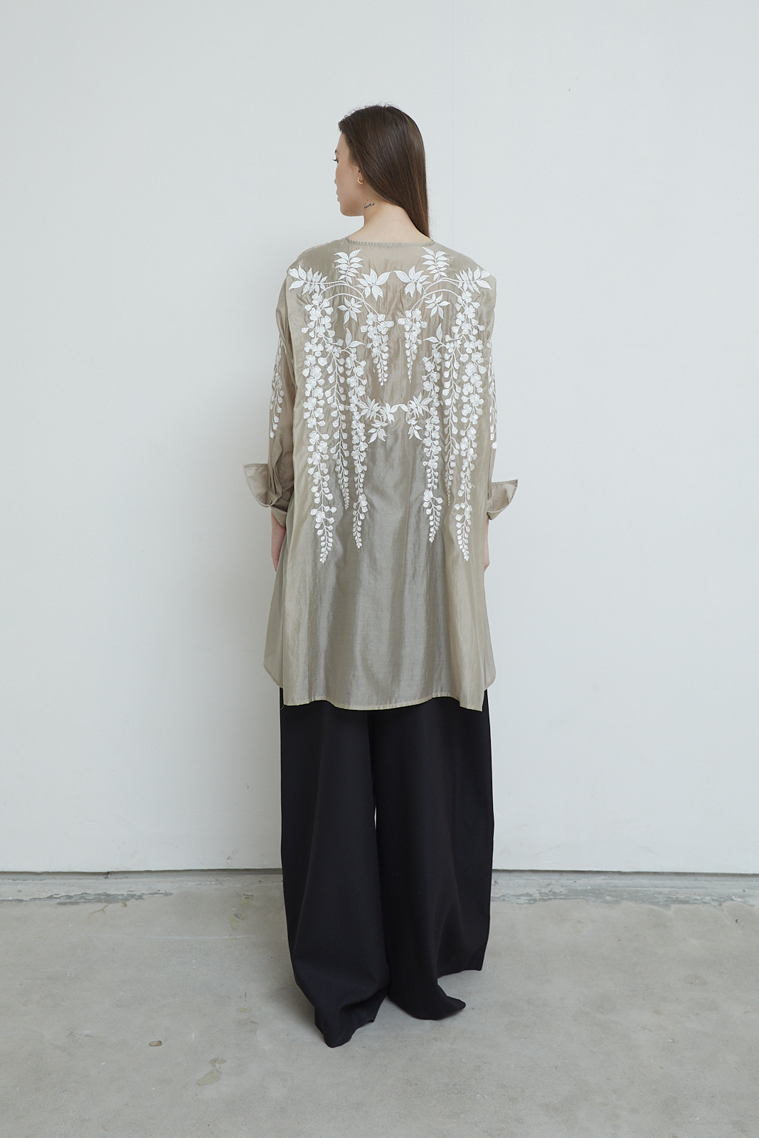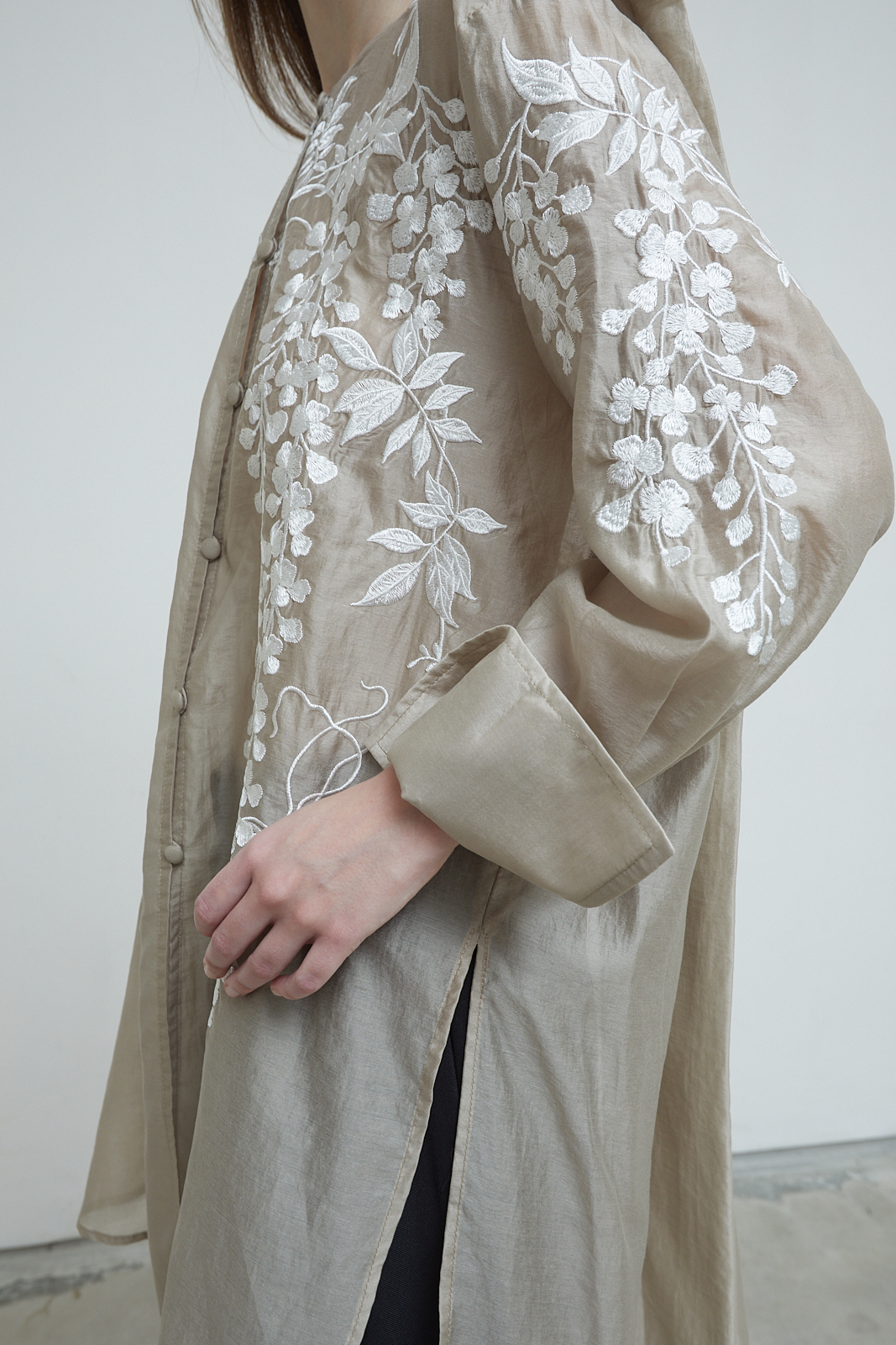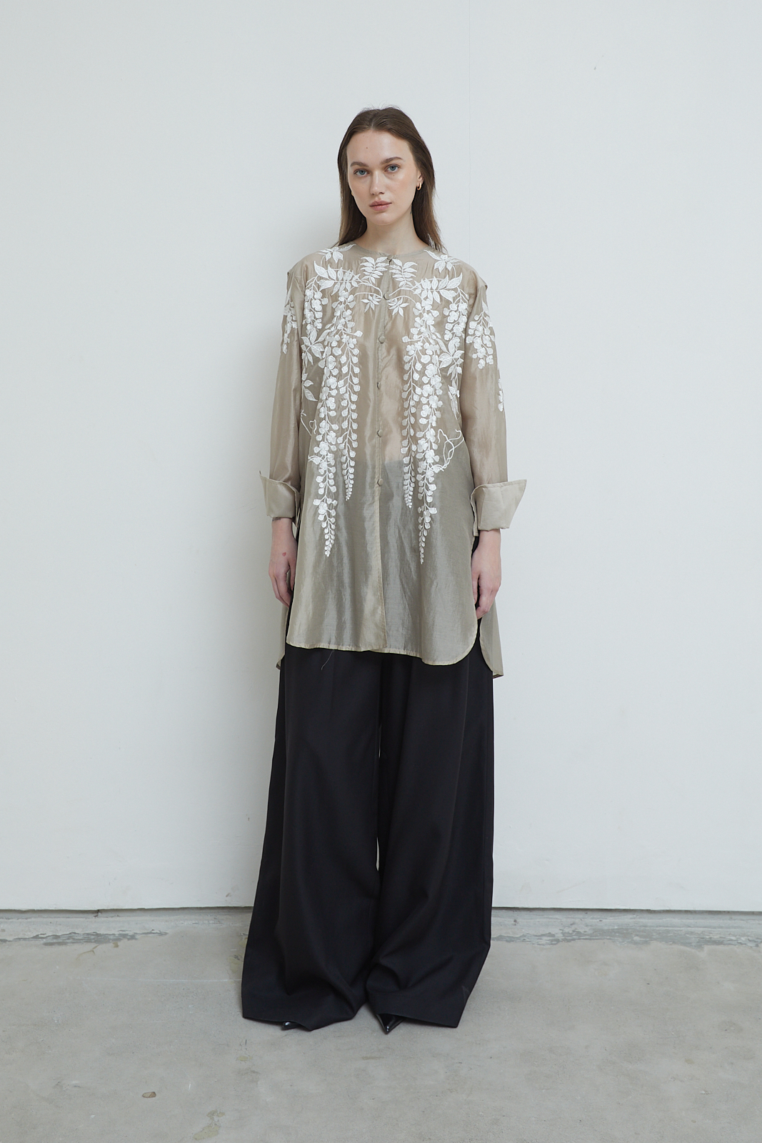 Signature embroidery. Long shirt with a relaxed, flowing cut. Sheer textured fabric with floral embroidery across the front, sleeves, and back. Lightweight and airy, designed to layer easily. Finished with folded cuffs.