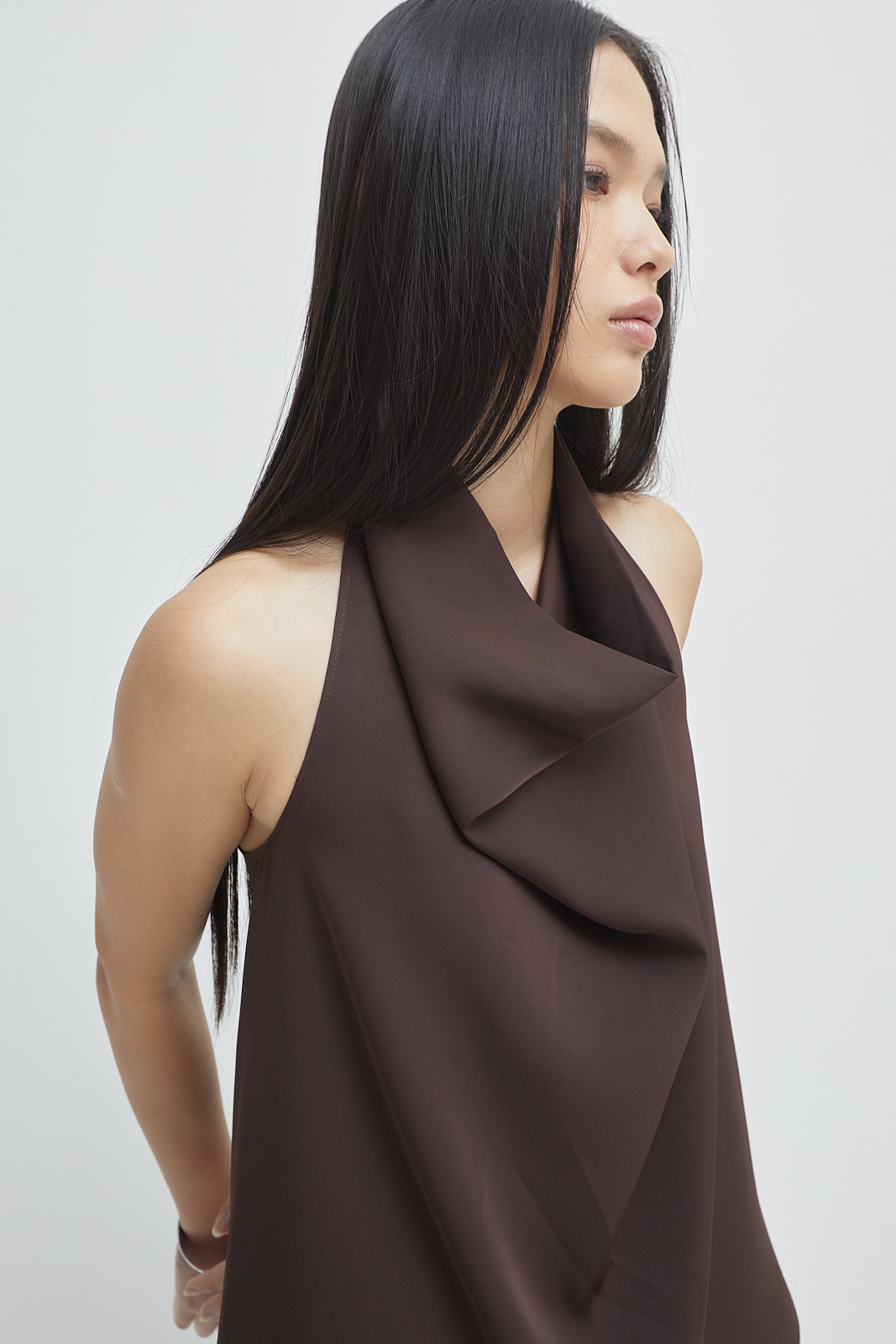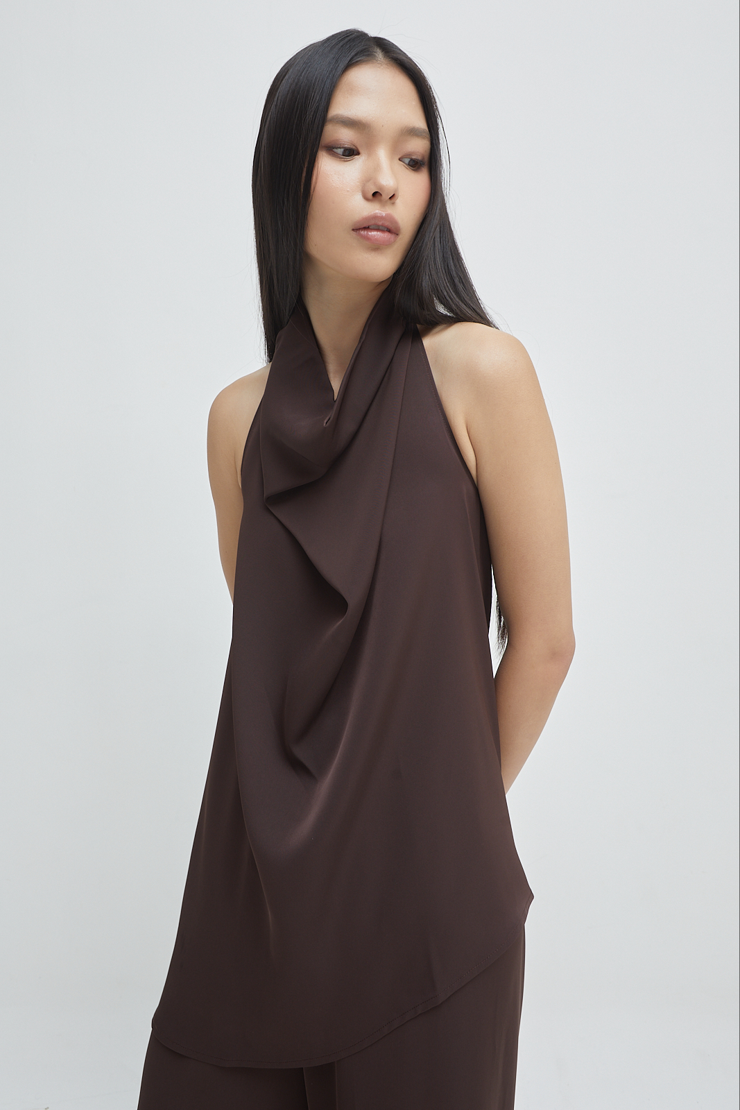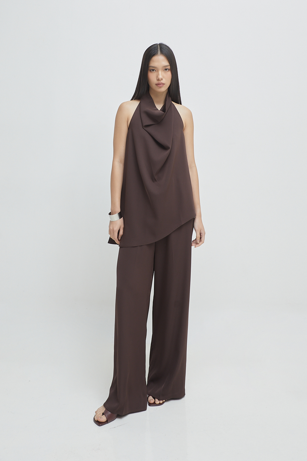 A relaxed halter top with a sculpted front drape and an elongated hem. Made from smooth, fluid fabric that holds shape without stiffness. Comfortable, breathable, and easy to pair with any wide-leg bottoms.