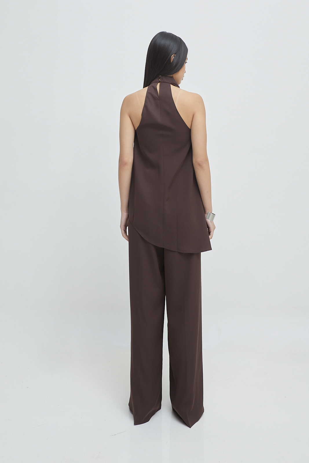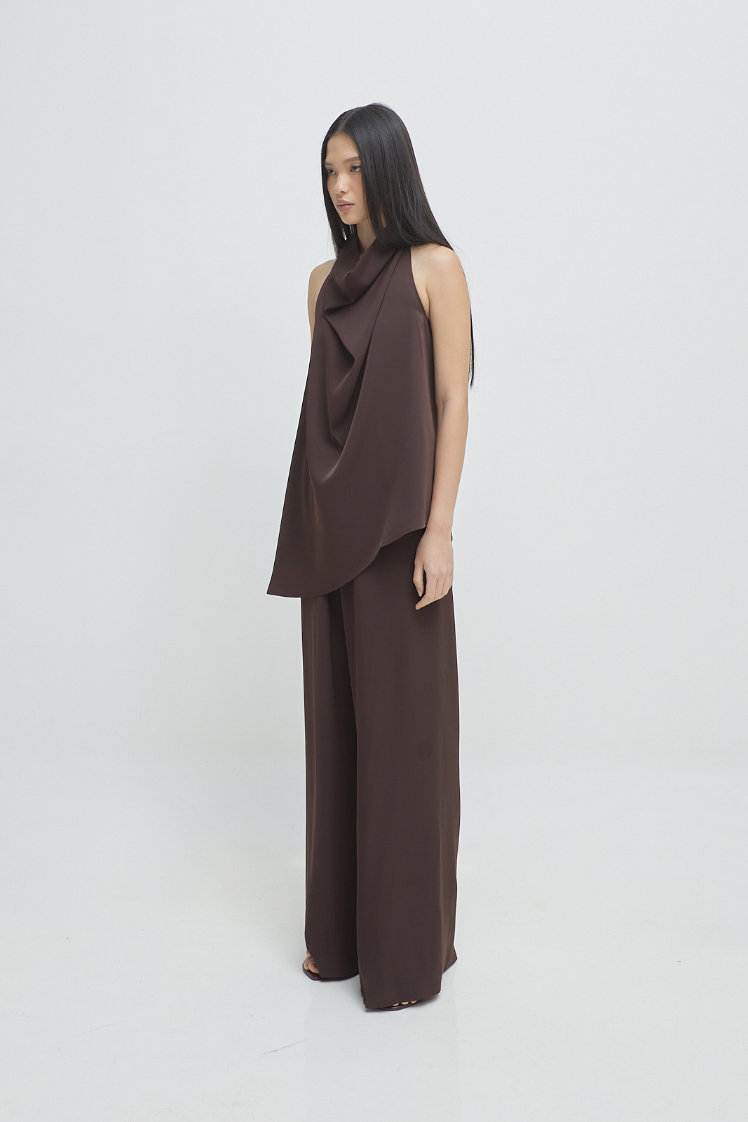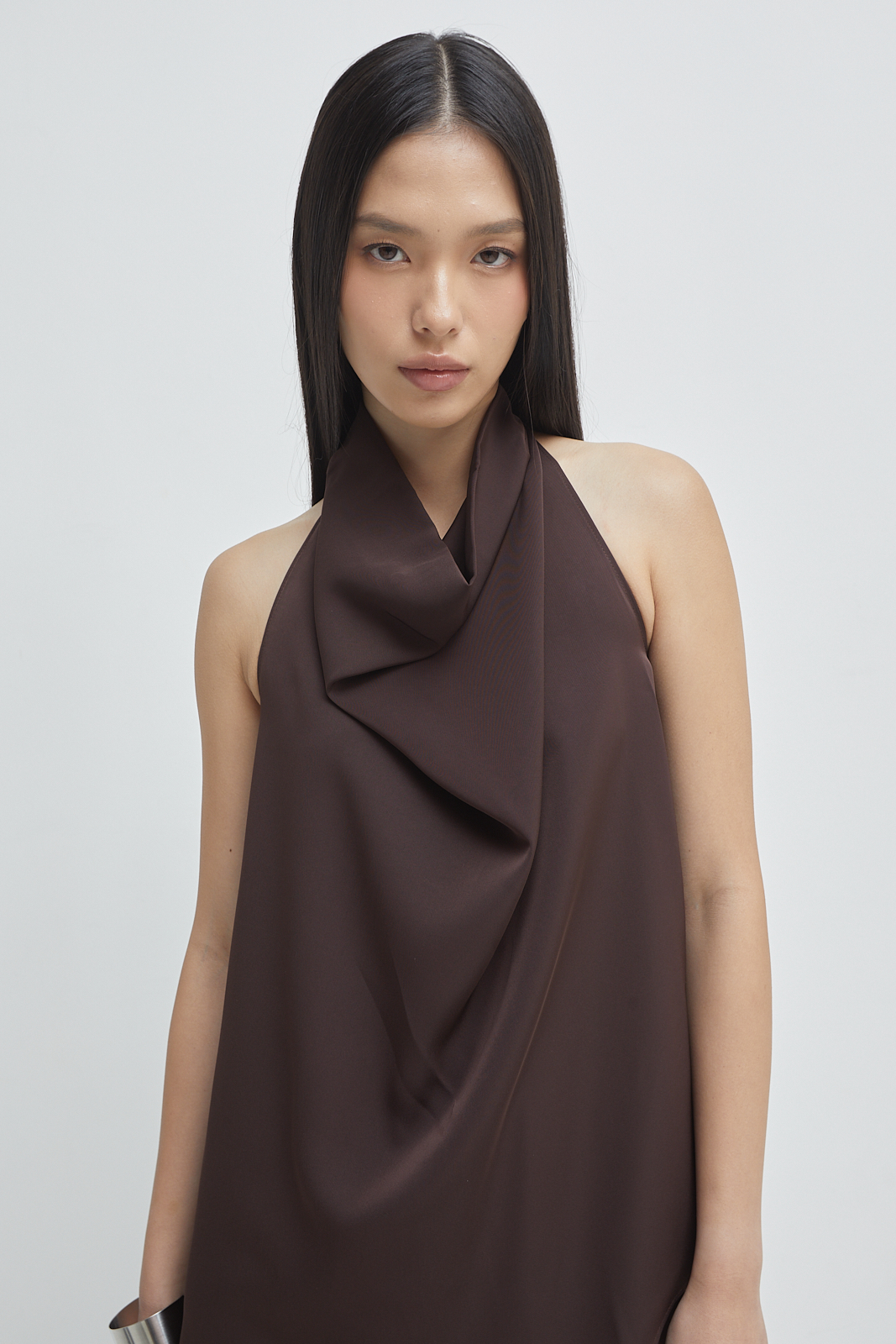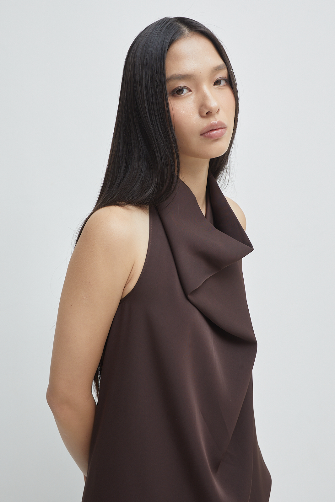 A relaxed halter top with a sculpted front drape and an elongated hem. Made from smooth, fluid fabric that holds shape without stiffness. Comfortable, breathable, and easy to pair with any wide-leg bottoms.