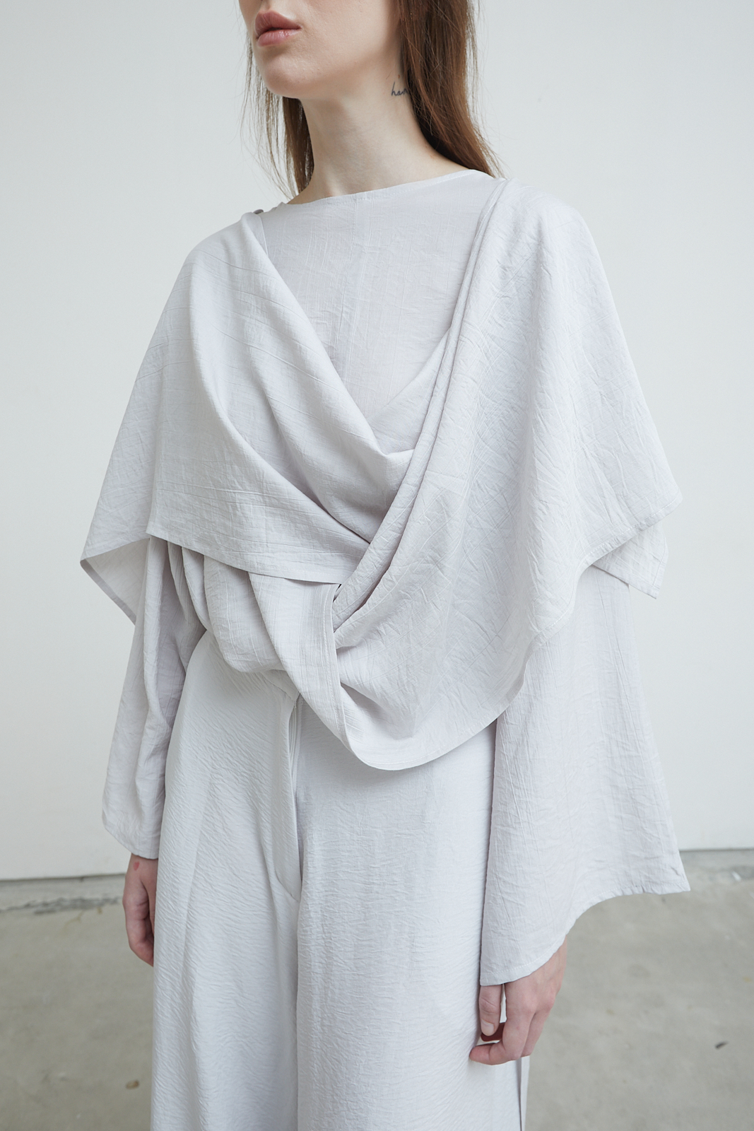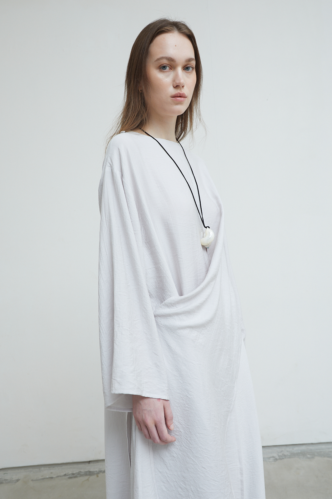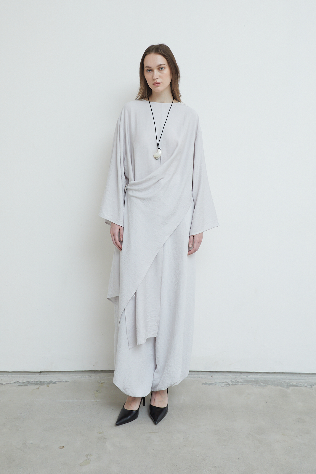 Long tunic with a relaxed, fluid silhouette. Draped front panel creates layered movement and can be styled in multiple ways. Lightweight fabric with a soft, natural fall. Designed to wear loose and adapt to different styling.