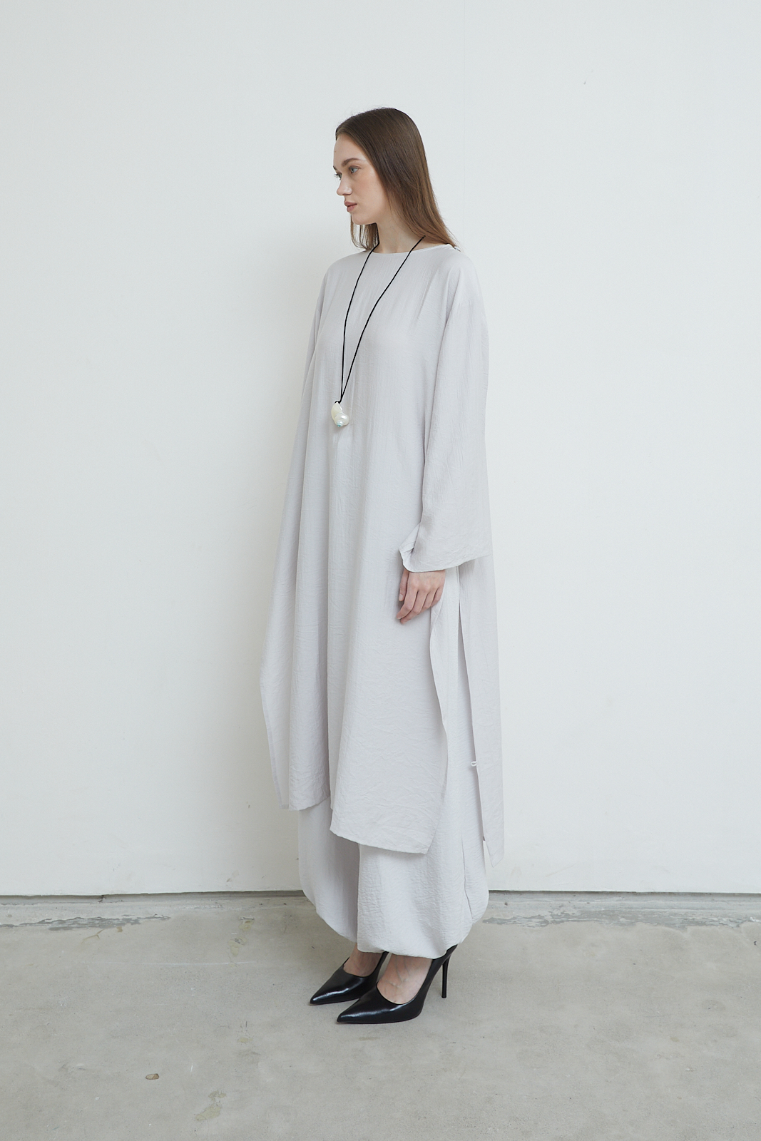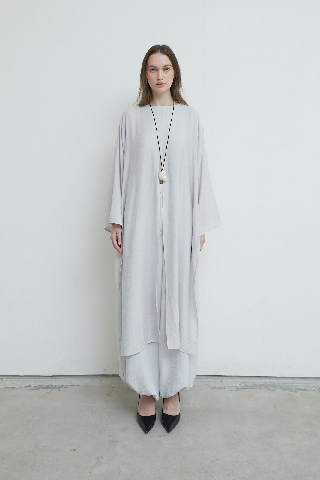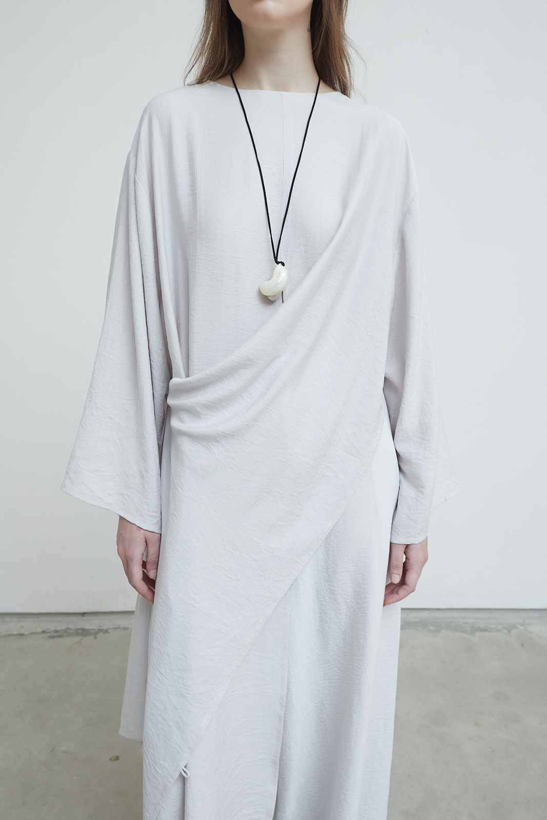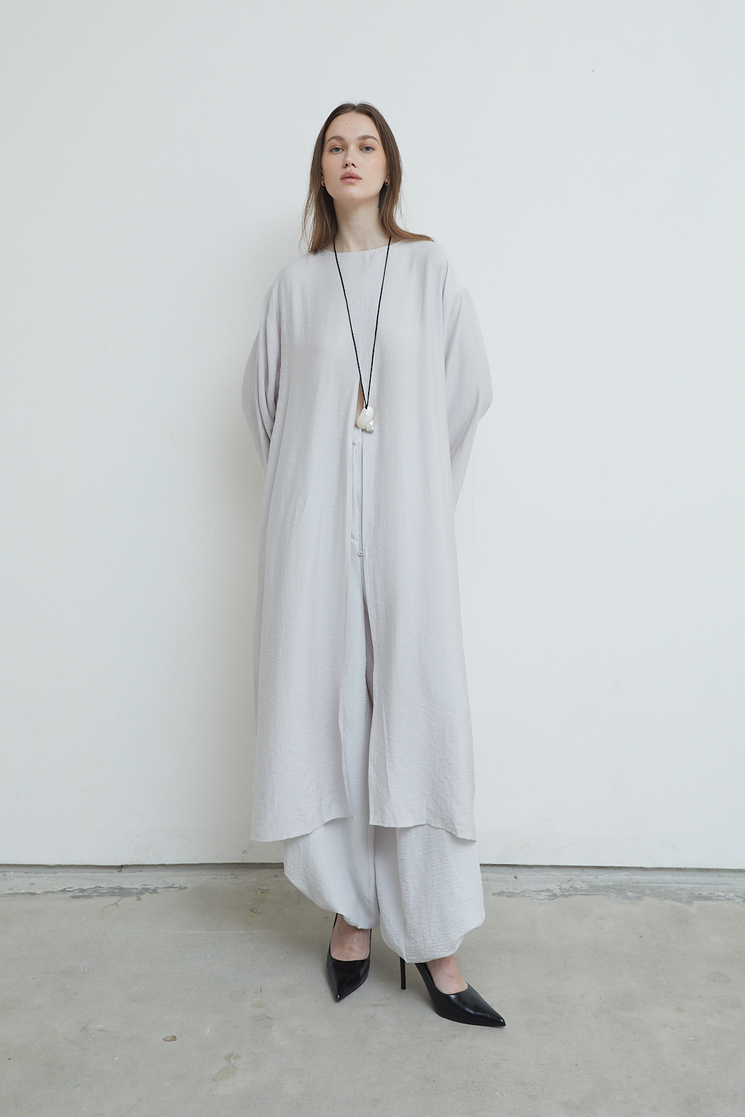 Long tunic with a relaxed, fluid silhouette. Draped front panel creates layered movement and can be styled in multiple ways. Lightweight fabric with a soft, natural fall. Designed to wear loose and adapt to different styling.