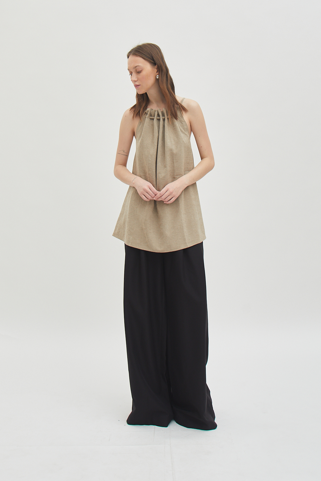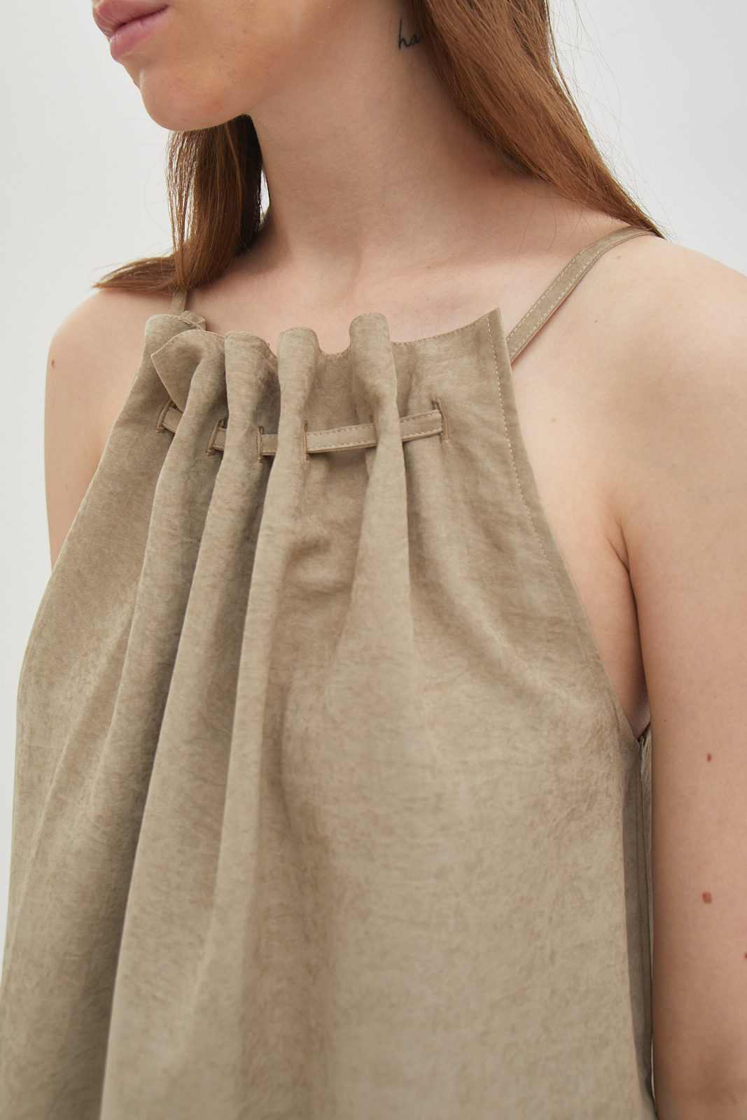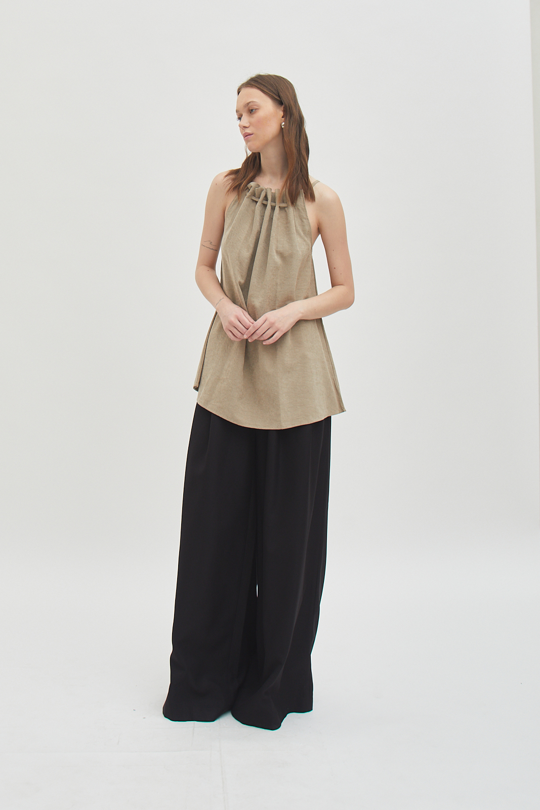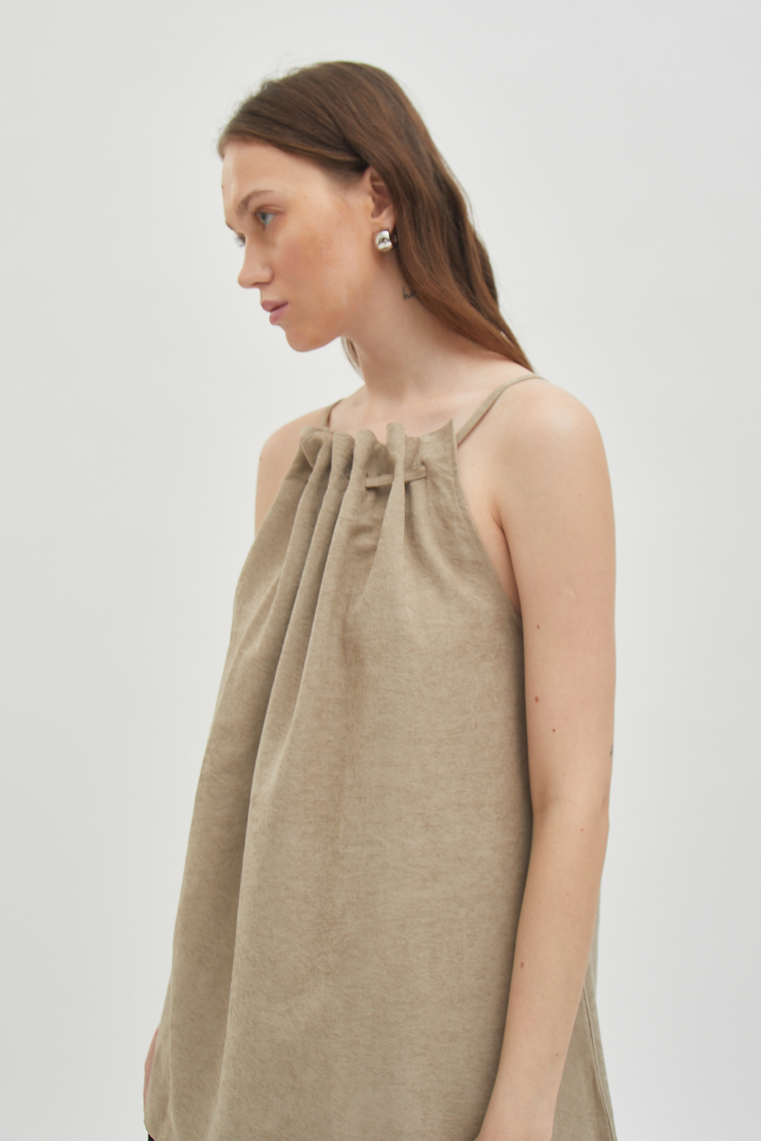 Sleeveless top made from brushed cotton twill. Soft surface with a structured drape that holds its shape. Gathered neckline creates natural volume without excess. Designed to be worn loose. Easy on its own or for layering.