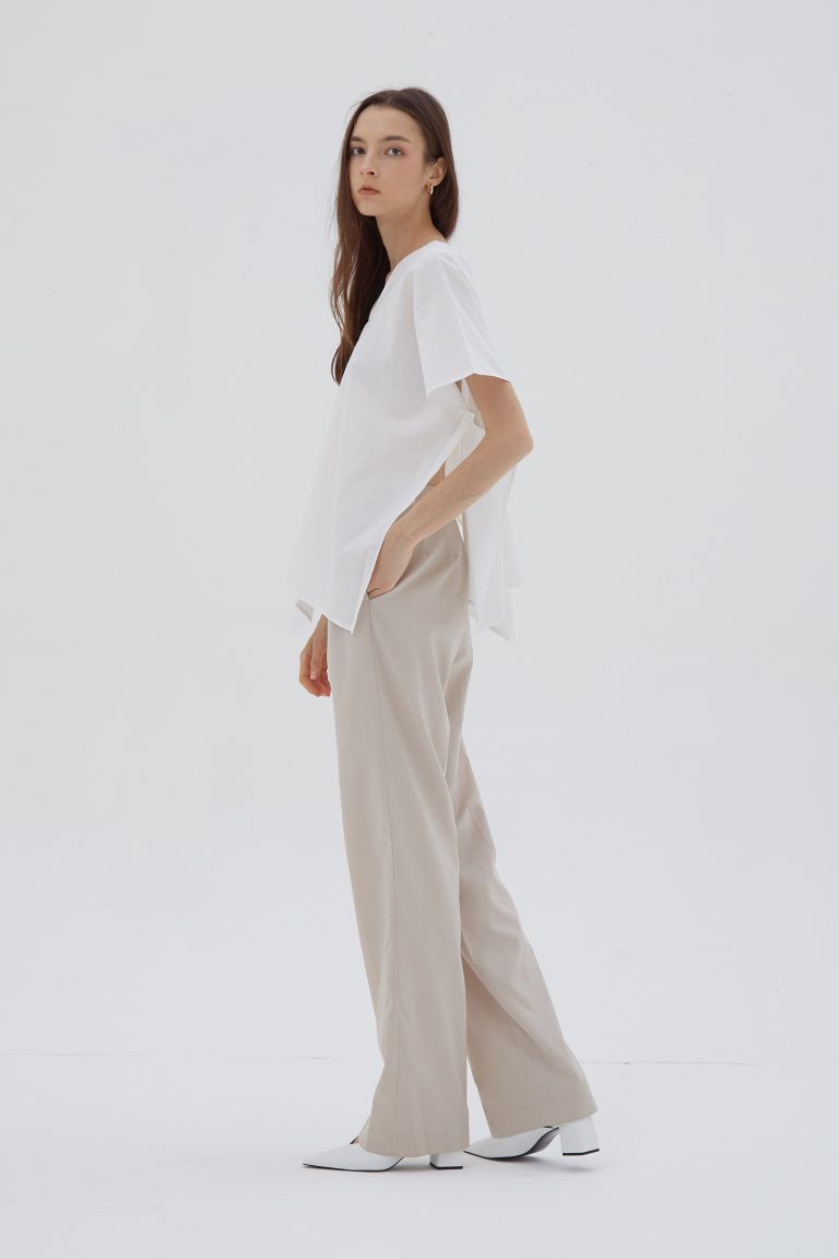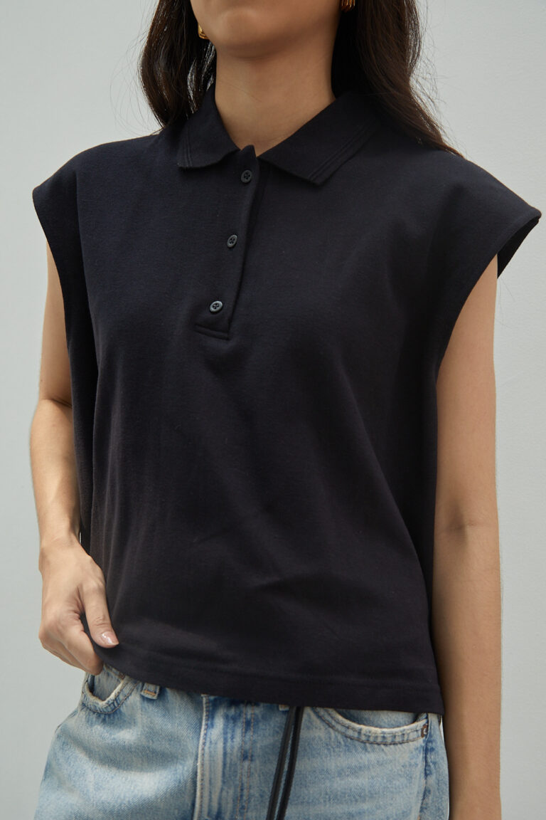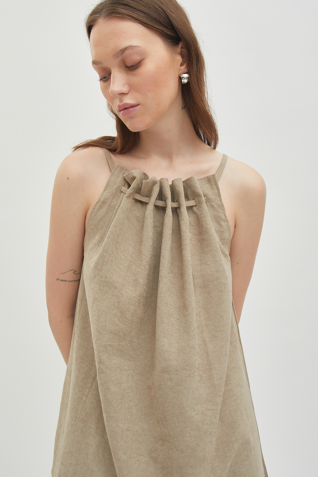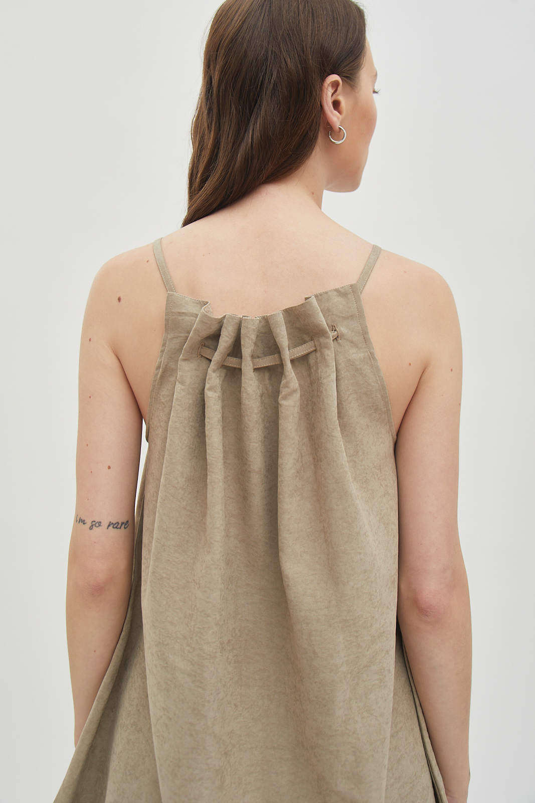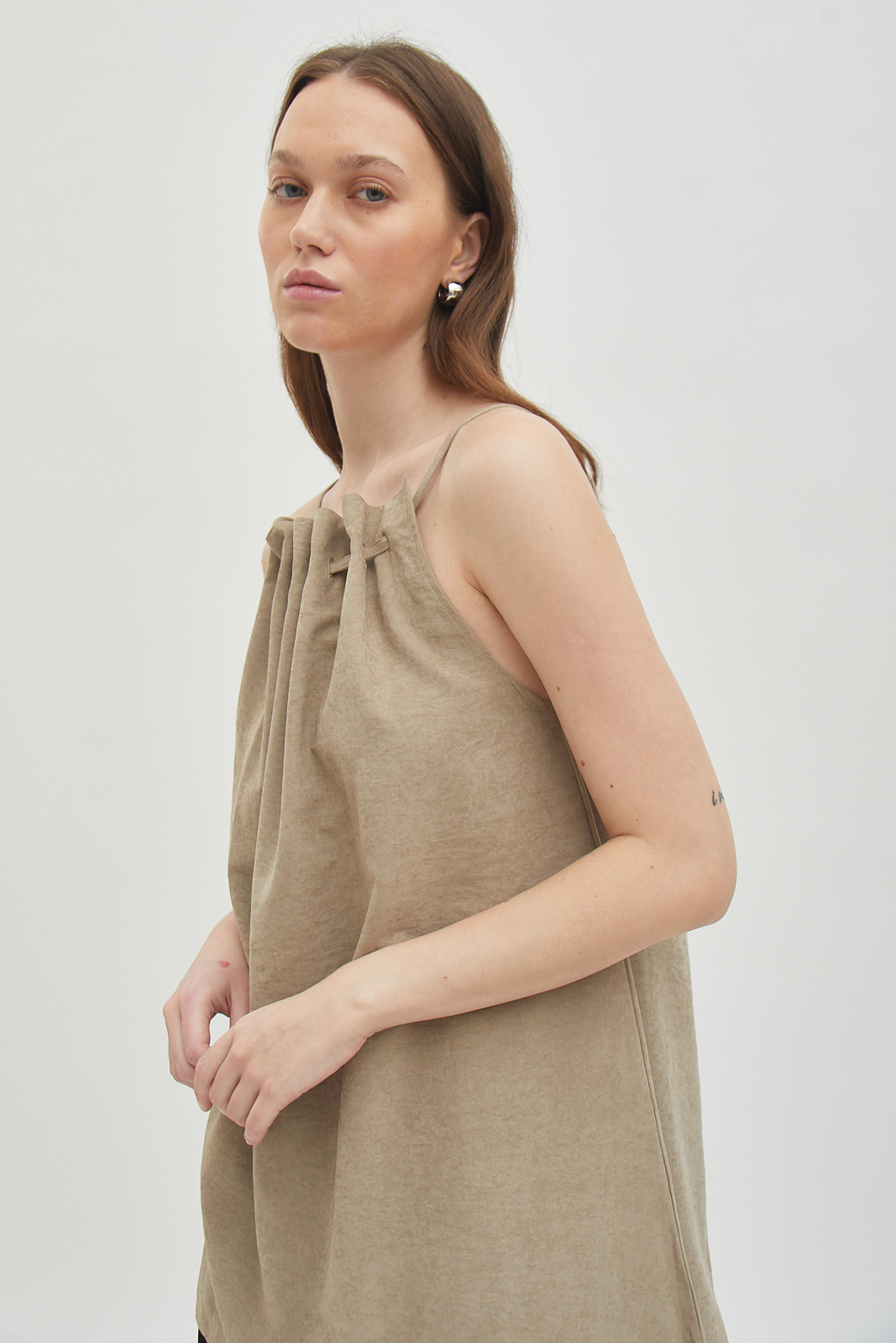 Sleeveless top made from brushed cotton twill. Soft surface with a structured drape that holds its shape. Gathered neckline creates natural volume without excess. Designed to be worn loose. Easy on its own or for layering.