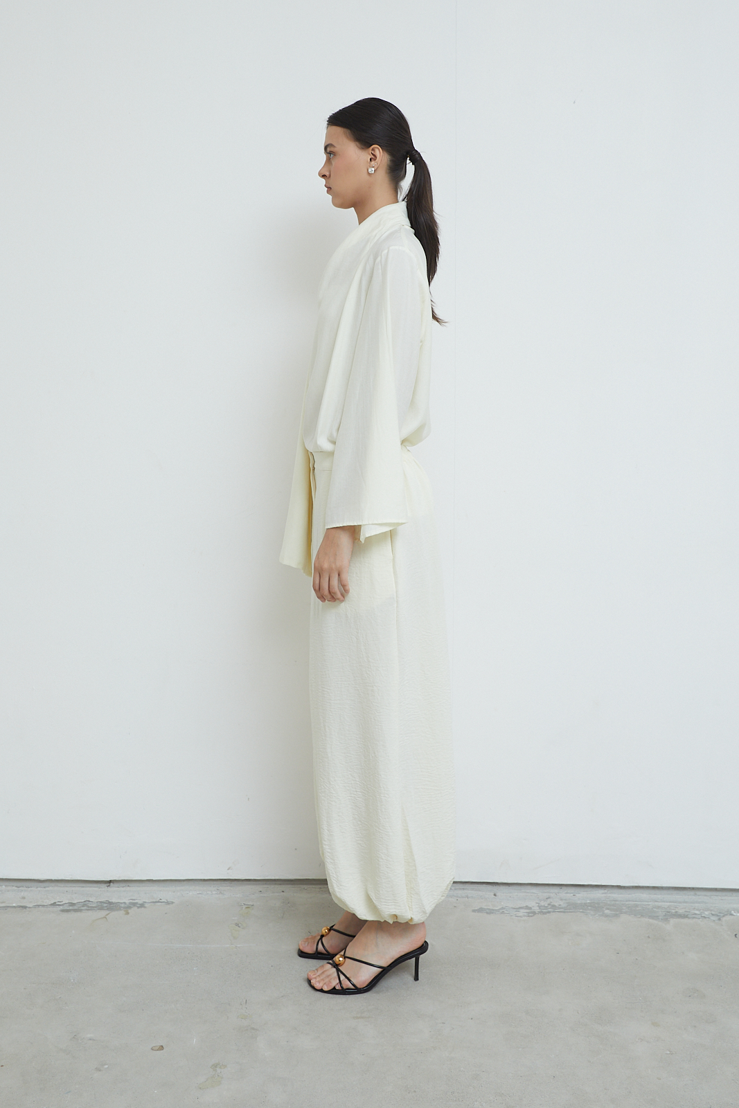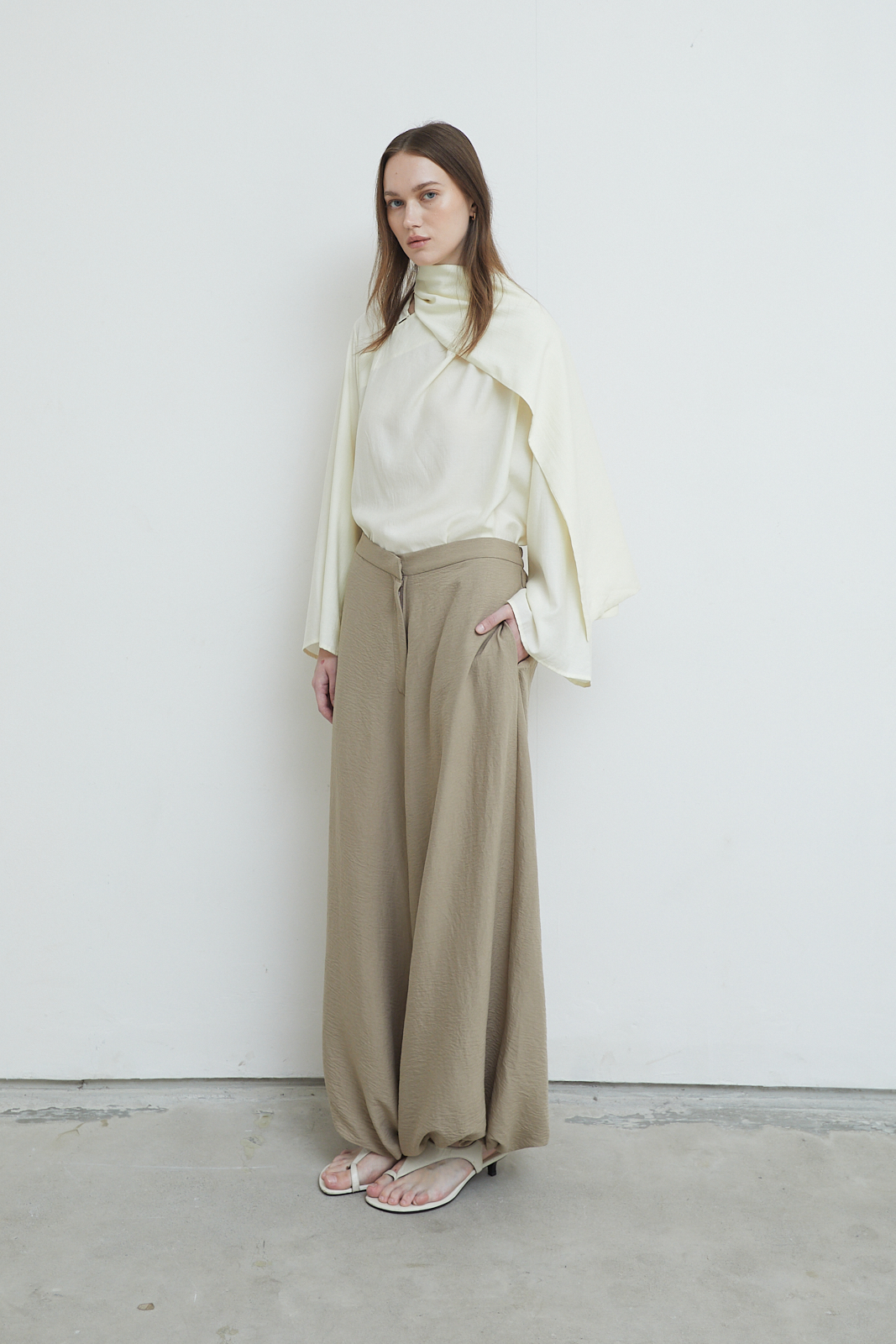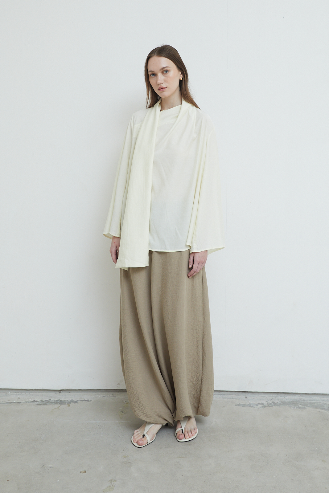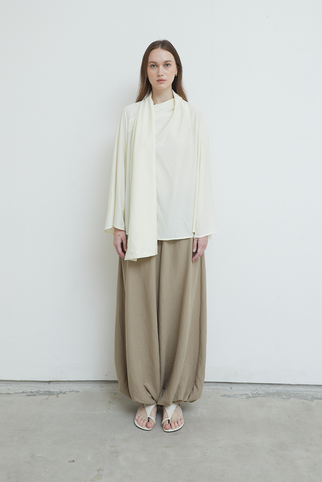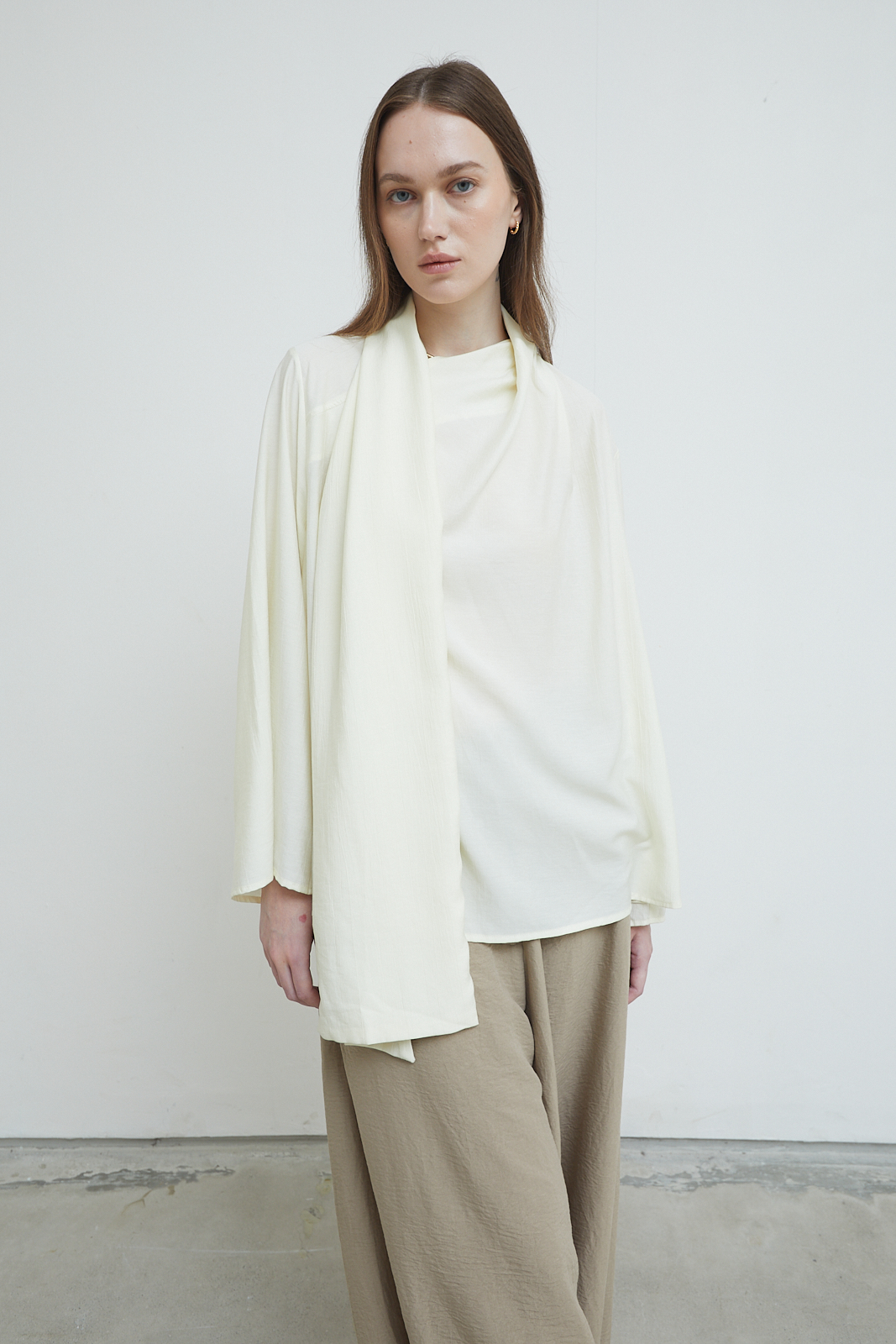Long-sleeve top with a relaxed silhouette and integrated scarf panel. Soft draped neckline with an extended scarf detail that falls naturally along the body. Lightweight fabric with a fluid, airy feel.