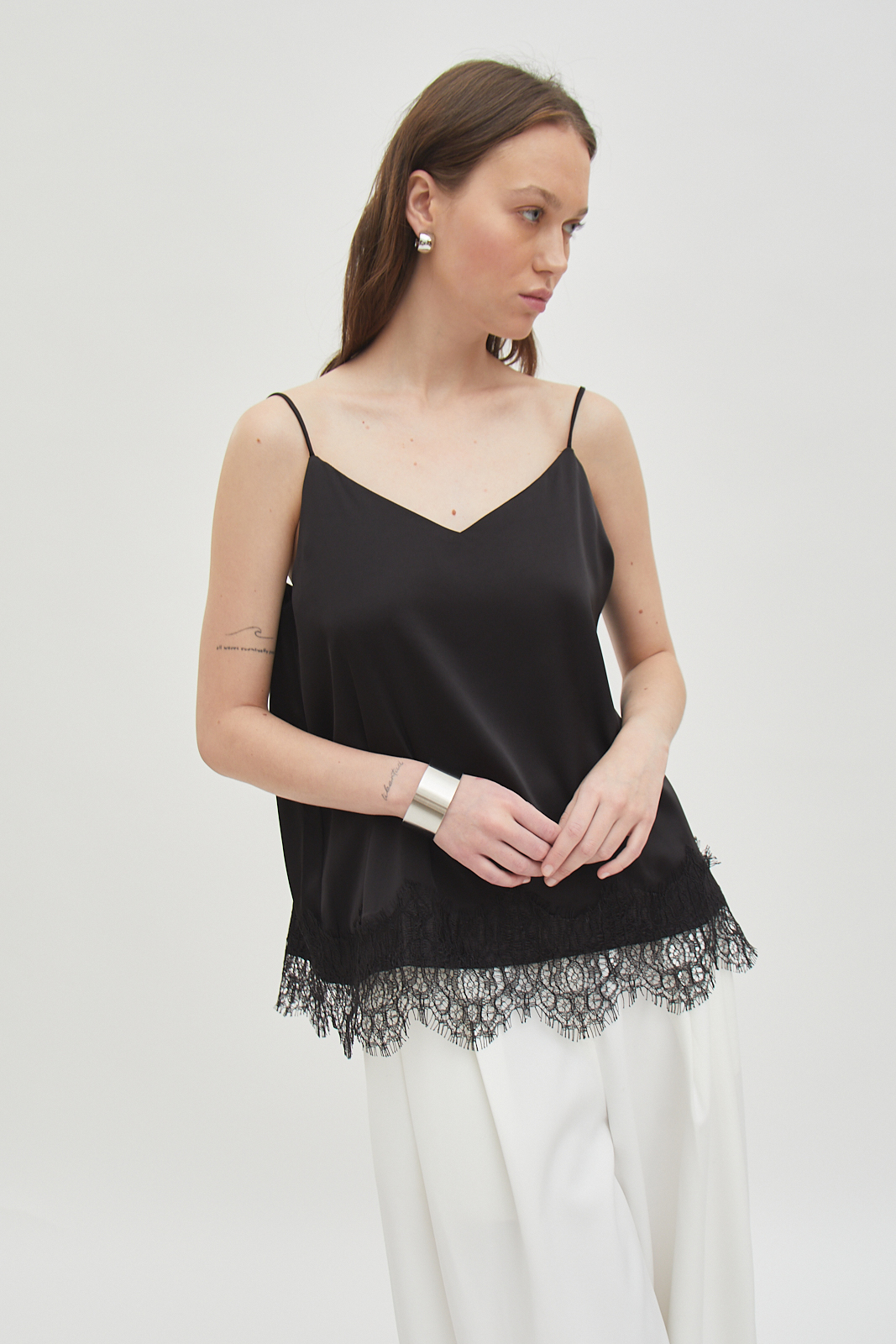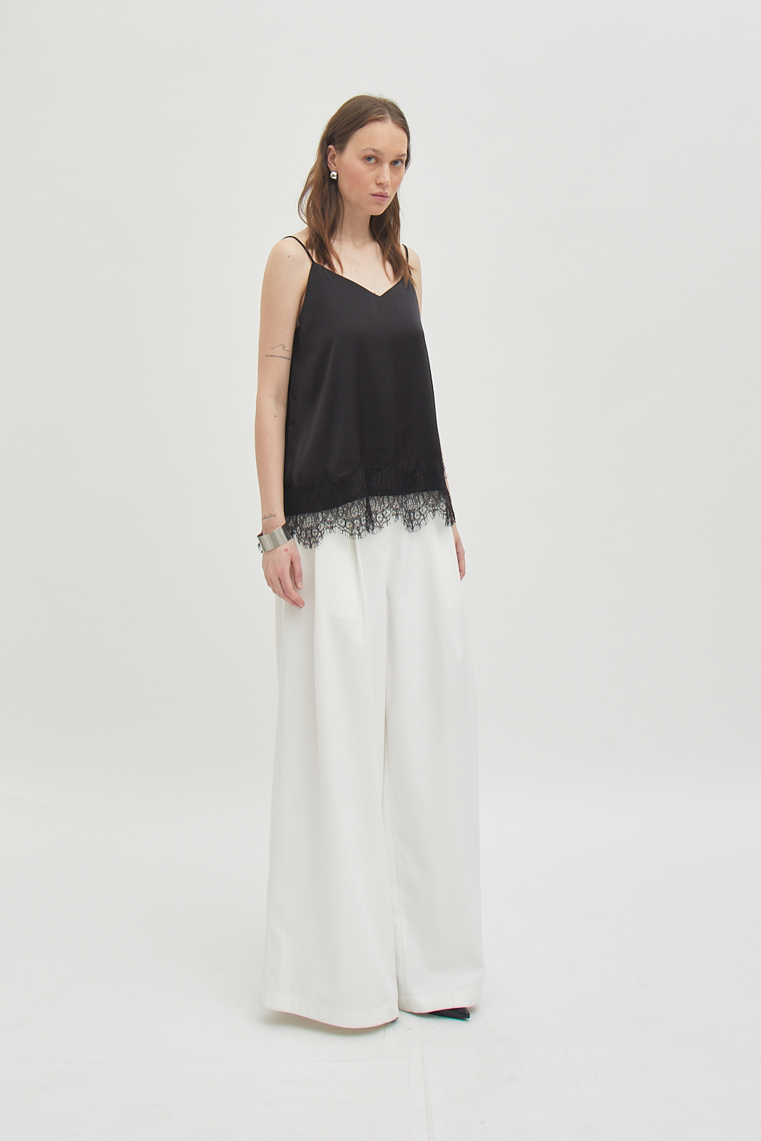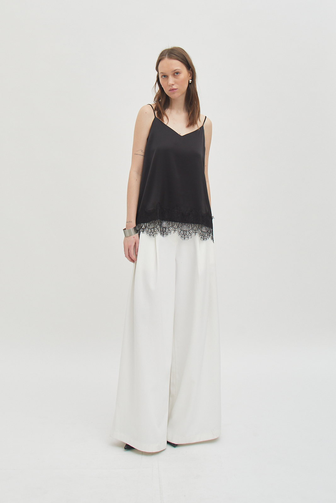 The Tonya Cami is a satin camisole with a lace-trimmed hem, designed with clean lines and a soft edge. It features a pull-over design, and a relaxed fit for effortless layering. Available in black and white