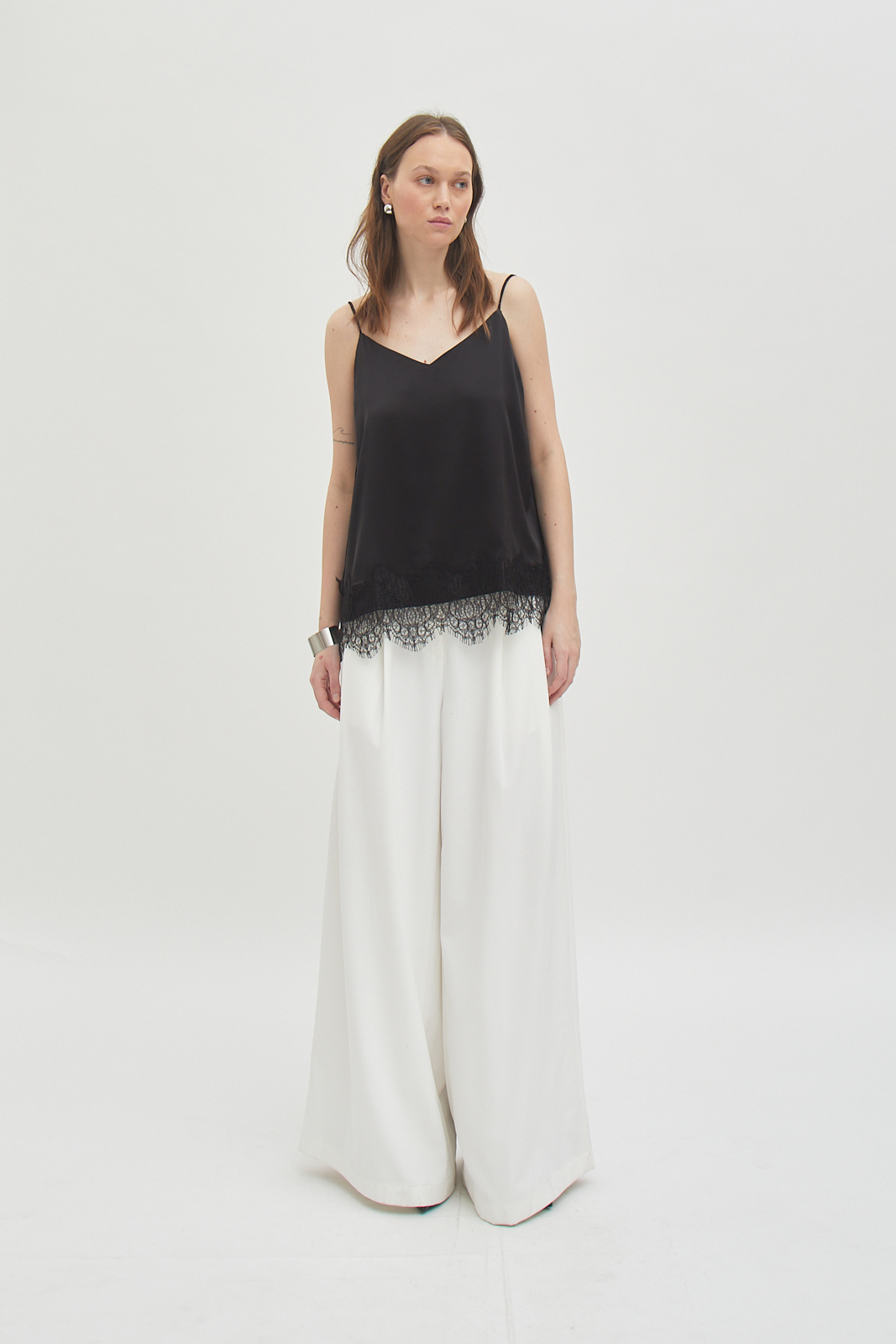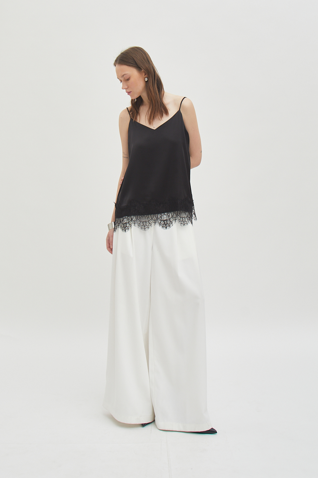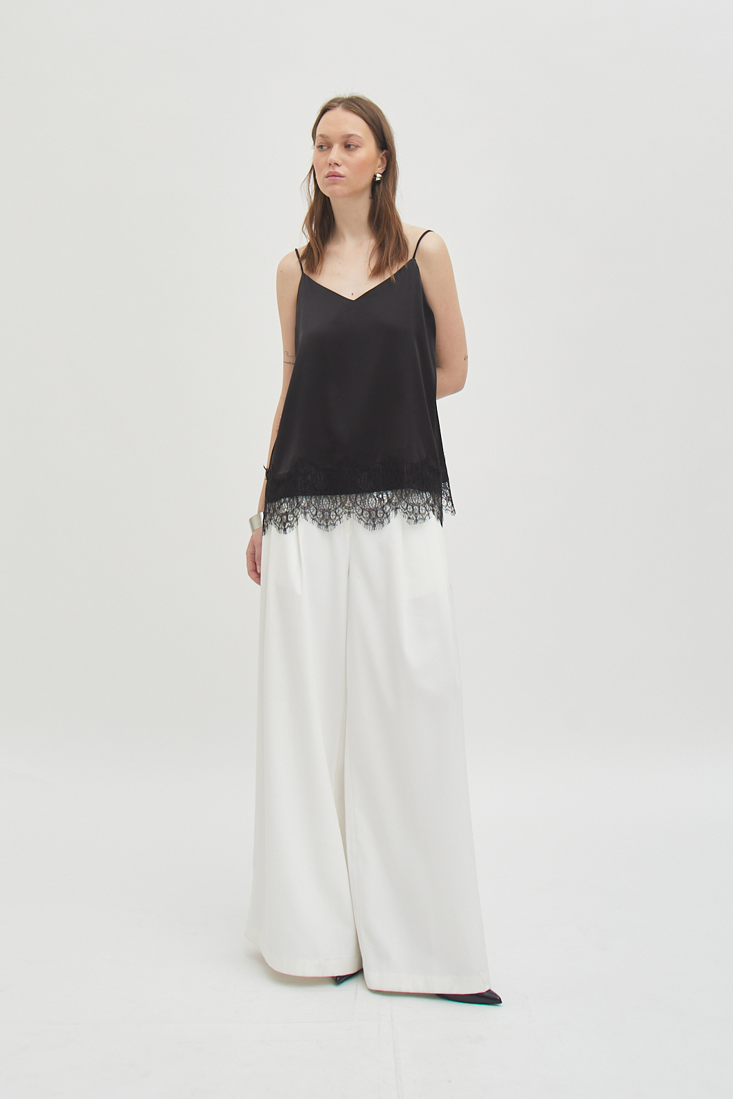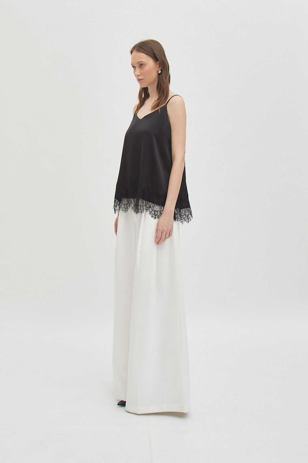 The Tonya Cami is a satin camisole with a lace-trimmed hem, designed with clean lines and a soft edge. It features a pull-over design, and a relaxed fit for effortless layering. Available in black and white