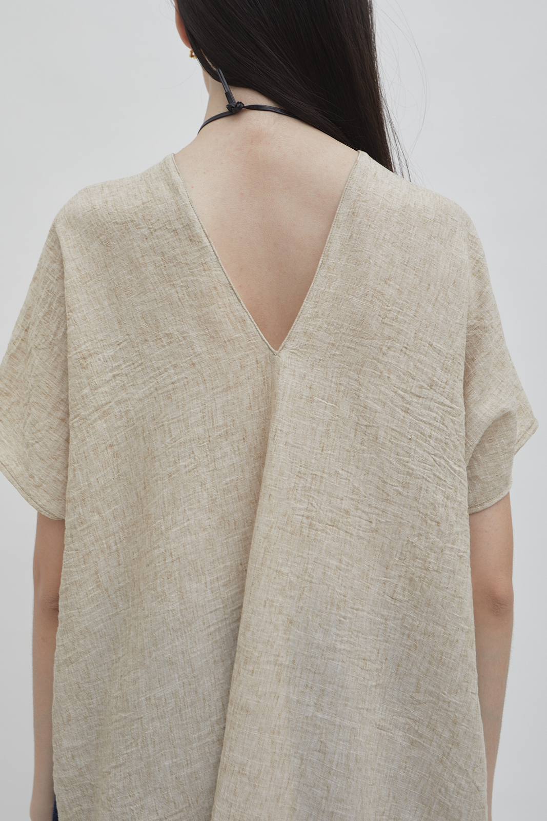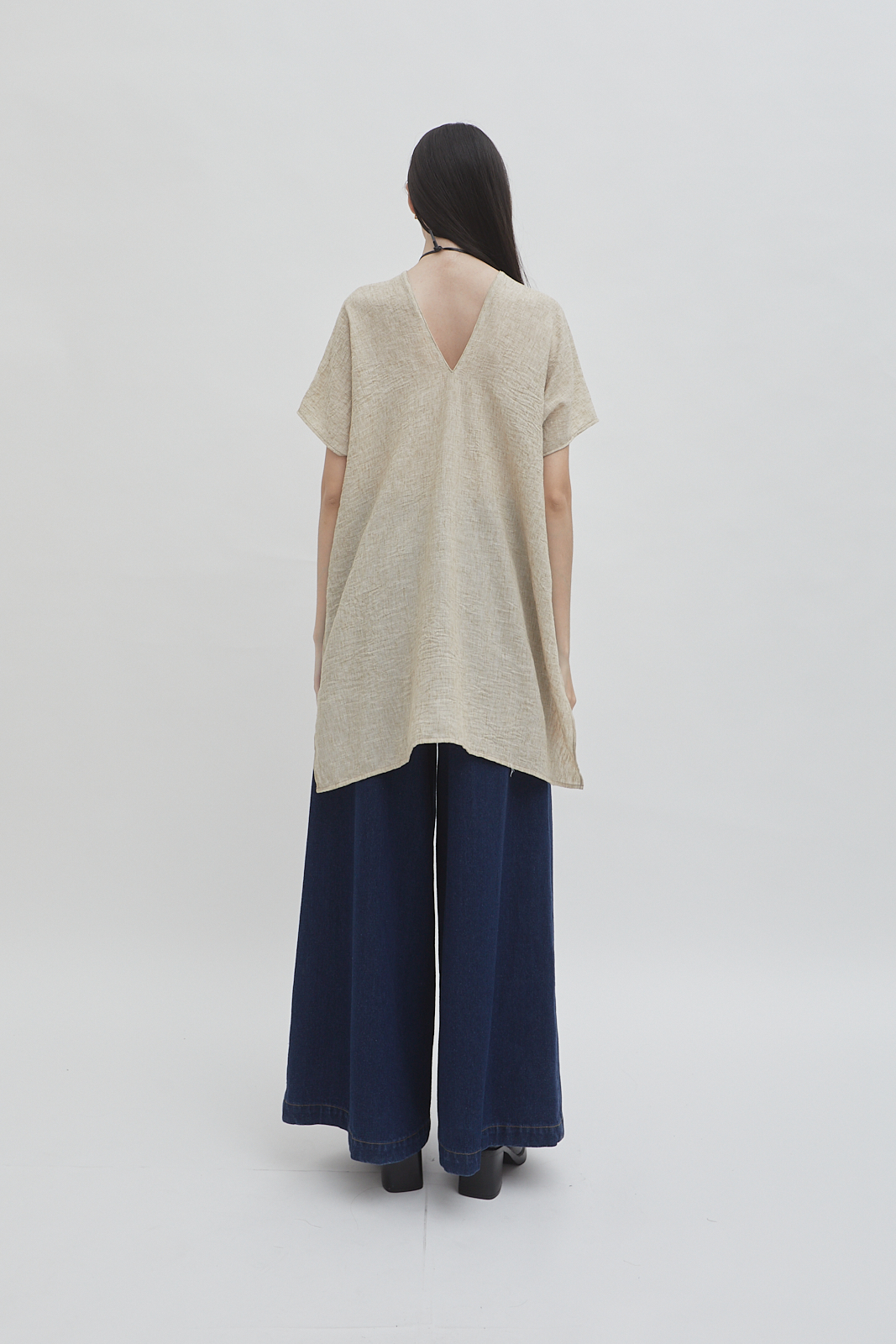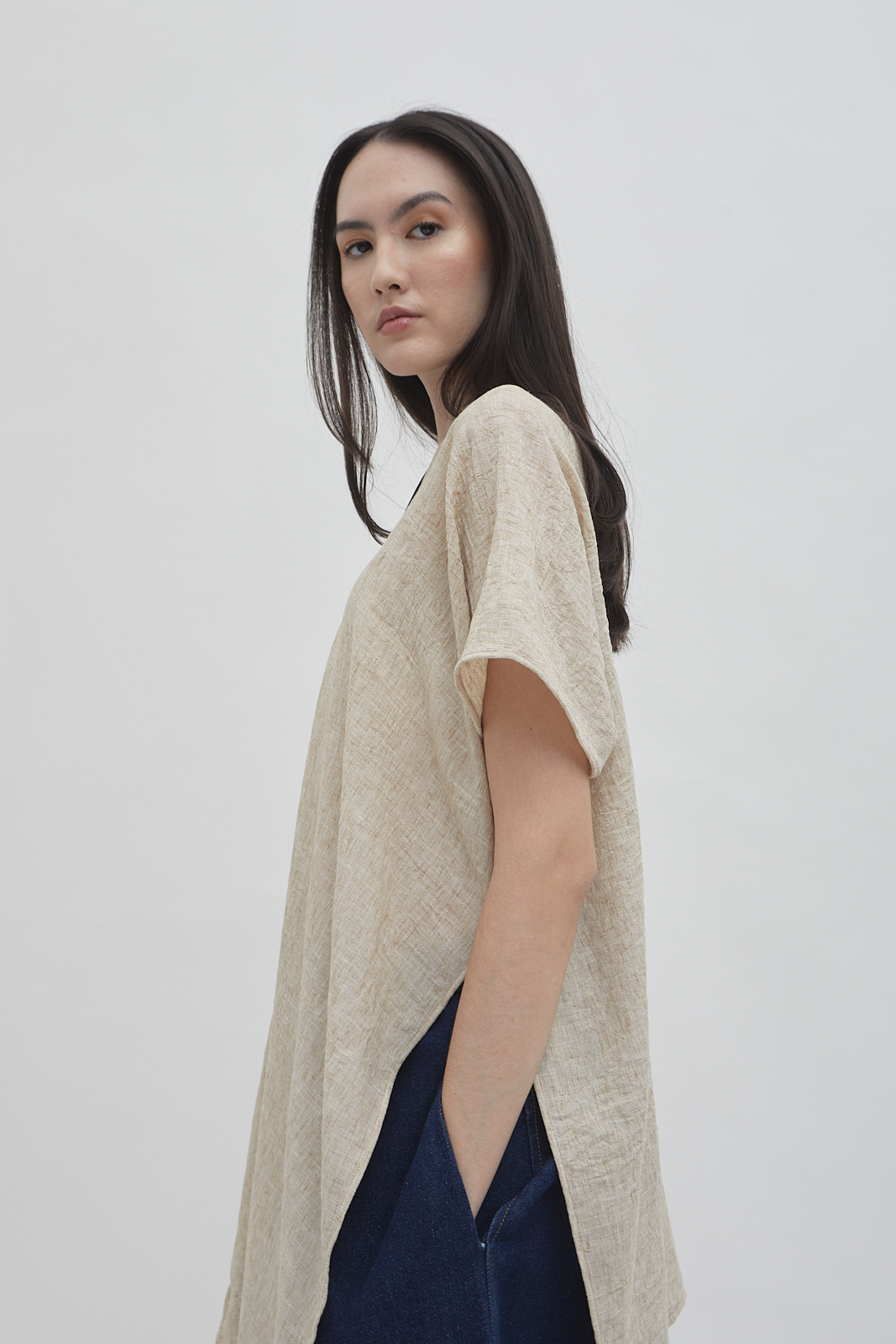 V neck cap sleeves top with elongated hem. Slits on both sides. Relax fit, rectangular cut.