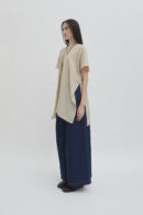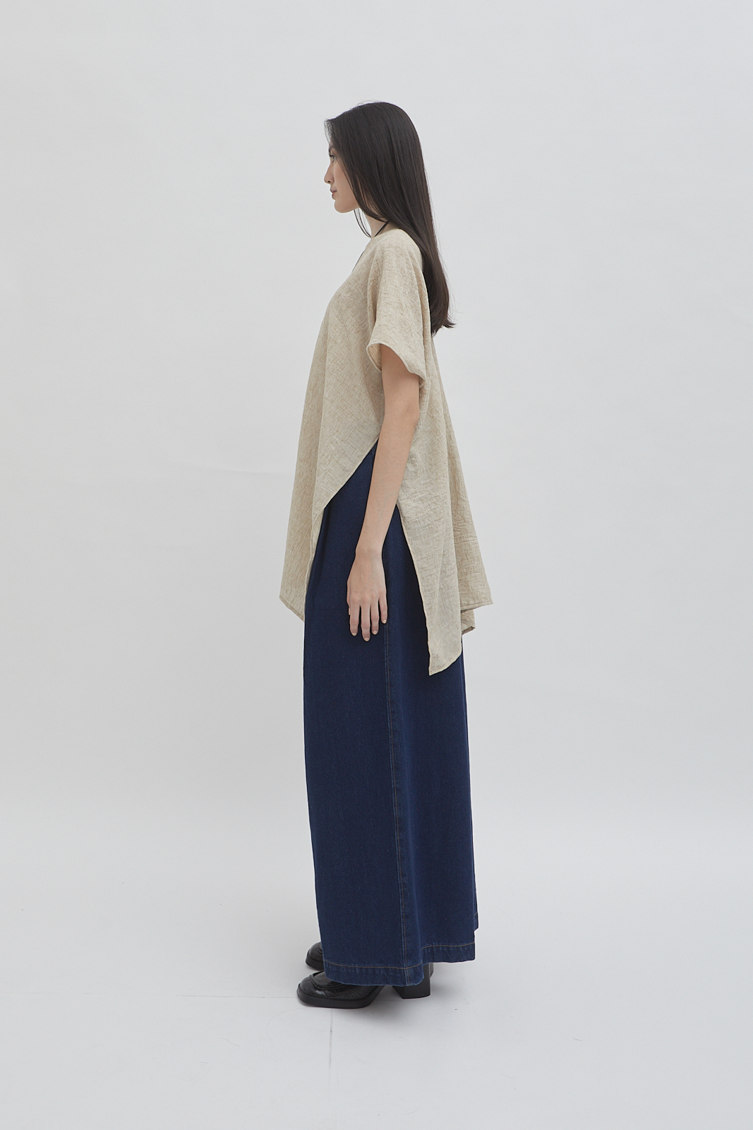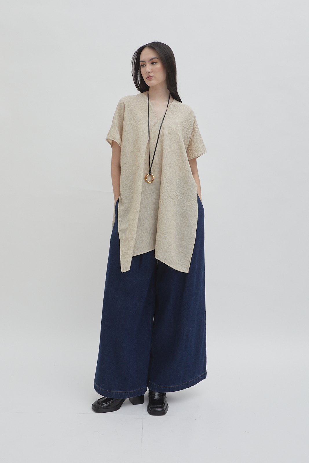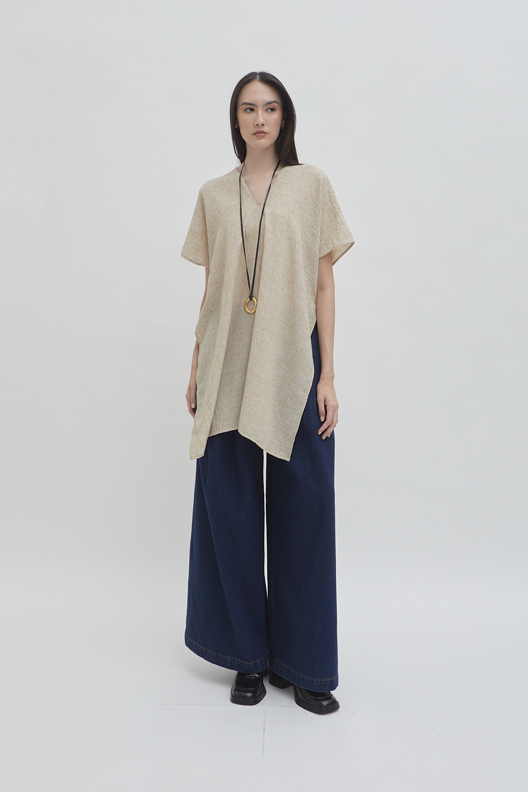 V neck cap sleeves top with elongated hem. Slits on both sides. Relax fit, rectangular cut.